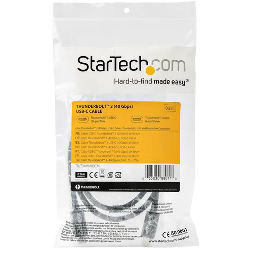 Provide four times the data transfer speed of any other cable type, enable dual 4K 60Hz video, and power your devices with a single cableThis Thunderbolt 3 to Thunderbolt 3 cable lets you deliver video, data and power to your Thunderbolt 3, USB 3.2 and DisplayPort devices. At 0.8 meters in length, the Thunderbolt cable provides added flexibility and distance when connected to your devices.USB-C CompatibilityFully compatible with your USB 3.2 Gen 2 devices, this cable can be used for charging and syncing your mobile devices. Also, connect and power USB-C laptops, such as your MacBook or Chromebook, and USB-C peripherals, such as your docking station.Unbelievable Data Transfer SpeedsThis Thunderbolt 3 USB-C cable supports data transfer rates up to 40Gbps when connected to a Thunderbolt 3 device, enabling lightning fast performance. When connected to a USB 3.2 device, this cable supports rates of 20Gbps.Enjoy Ultra High Definition VideoThis cable supports dual 4K 60Hz or full 5K 60Hz video for an astonishing resolution, contrast, and color depth.Versatile Power DeliveryThe Thunderbolt 3 Type-C cable delivers up to 100W of power for charging a Thunderbolt 3 laptop, which means you can keep your devices powered without using an additional power supply.Enable Thunderbolt NetworkingBridge multiple Thunderbolt 3 USB-C enabled laptops for peer-to-peer 10GbE networking with this cable. It’s also perfect for sharing peripherals such as printers and storage.TBLT34MM80CM is backed by a StarTech.com 2-year warranty and free lifetime technical support.The StarTech.com Advantage