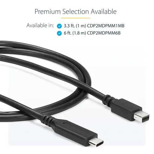 Mini DP Adapter Cable | Thunderbolt™ 3 Compatible | USB 3.1 Type-C™This USB-C to Mini DisplayPort cable lets you connect your Thunderbolt 3 or USB Type-C enabled device to a Mini DP monitor with just one cable, for a convenient, clutter-free connection.Astonishing Picture QualityHarness the video capabilities that are built into your USB-C connection. The USB Type-C to Mini DisplayPort cable delivers the astonishing quality of Ultra HD to your 4K display, at resolutions up to 3840 x 2160. Plus, the adapter is backward compatible with 1080p displays, which makes it a great accessory for home, office or other work environments.Clutter-Free InstallationAt 1 m (3.3 ft.) in length, this Mini DP cable delivers a compact connection that eliminates excess adapters and cabling, ensuring a tidy, professional installation. For longer installations, we also offer a 6 ft. (1.8 m) USB-C to mDP cable, enabling you to choose the right cable length for your custom installation needs.Hassle-Free SetupFor easy operation and installation, this USB 3.1 Type-C to Mini DP adapter cable supports plug-and-play installation on both Windows and Mac computers.CDP2MDPMM1MB is backed by a 3-year StarTech.com warranty and free lifetime technical support.The StarTech.com Advantage