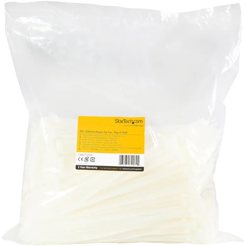 1000 Pack | Extra Large | 10" 254 mm | White | Nylon 66 |94V-2 Fire & UL Rated | TAA | ULThese Extra-Large cable ties enable you to conveniently bundle and secure multiple cables, to route and organize them. 1000 White cable ties are included, ensuring you'll have plenty on hand.Keep Cables OrganizedThese plastic electrical cable wraps are 10" (25 cm) in length securing cable bundles up to 2.67" (68 mm) in diameter. They're quick and easy to install or remove, with adjustable tension and a basic one-piece design -- perfect for organizing network cables, power cables, or other cables at your home or office workstation.Industrial StrengthMade of durable Nylon 66 material, these cable ties are tough and flexible. They've been rigorously tested to support up to 50 lbs (22.7 kg) of weight & are UL94 V-2 fire rated, UL Approved, and CE & Lloyd's Register Certified.Available in Different Lengths and ColorsTo suit any application, StarTech.com offers a wide selection of these cable ties in different lengths and colors:100-pack - 4" (10 cm) Black Cable Ties (CBMZT4B)100-pack - 4" (10 cm) White Cable Ties (CBMZT4N)1000-pack - 4" (10 cm) Black Cable Ties (CBMZT4BK)1000-pack - 4" (10 cm) White Cable Ties (CBMZT4NK)100-pack - 6" (15 cm) Black Cable Ties (CBMZT6B)100-pack - 6" (15 cm) White Cable Ties (CBMZT6N)1000-pack - 6" (15 cm) Black Cable Ties (CBMZT6BK)1000-pack - 6" (15 cm) White Cable Ties (CBMZT6NK)100-pack - 8" (20 cm) Black Cable Ties (CBMZT8B)100-pack - 8" (20 cm) White Cable Ties (CBMZT8N)1000-pack - 8" (20 cm) Black Cable Ties (CBMZT8BK)1000-pack - 8" (20 cm) White Cable Ties (CBMZT8NK)100-pack - 10" (25 cm) Black Cable Ties (CBMZT10B)100-pack - 10" (25 cm) White Cable Ties (CBMZT10N)1000-pack - 10" (25 cm) Black Cable Ties (CBMZT10BK)1000-pack - 10" (25 cm) White Cable Ties (CBMZT10NK)These cable wraps are backed by a StarTech.com Lifetime warranty and free 24/5 technical support. StarTech.com has been the IT professionals choice for over 30 years.The StarTech.com Advantage