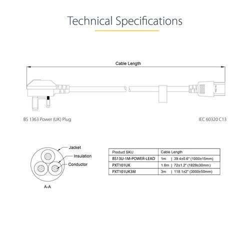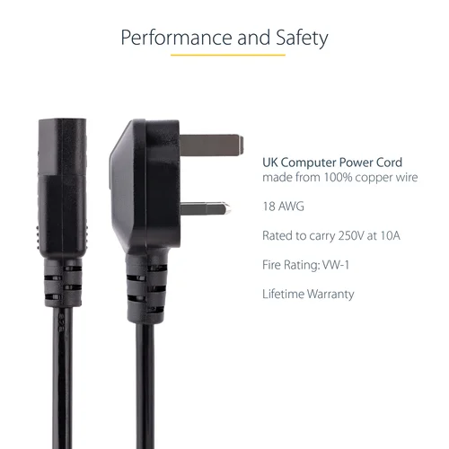 10ft (3m) UK Computer Power Cable, 18AWG, BS 1363 to C13 CordThe PXT101UK3M UK Computer Power Cord, features one BS 1363 plug and one C13 connector, making it a suitable replacement for worn-out or missing PC power cords.Designed for durability and dependability, this 3-Pin Mains Power Lead is backed by our Lifetime Warranty.The StarTech.com Advantage