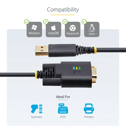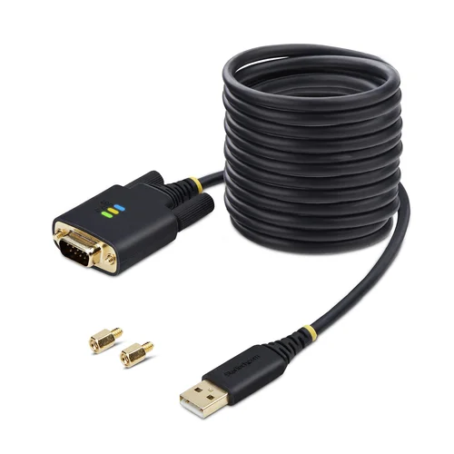 Add an RS232 serial port to a laptop or desktop, using an available USB-A portAdd RS-232 serial communication support to USB-A enabled Data Terminal Equipment (DTE - e.g., desktop or laptop), using this 10ft (3m) straight through USB to Serial Adapter Cable.Serial Port ExpansionThe USB Serial Adapter adds an RS-232 serial DB/DE-9 (male) connector to a desktop or laptop via a USB Type-A port. Secure the adapter to a serial device, using pre-installed and removable slotted D-Sub thumbscrews or install the included DB-9 Nuts for compatibility with other serial peripheral devices or cables.LED IndicatorsData transmission and reception LED indicators on the adapter provide real-time monitoring of port activity. The USB LED indicates when the adapter has successfully enumerated on the desktop or laptop. All the LEDs aid with diagnostics and troubleshooting.Seamless ConnectivityThe adapter is compatible with Windows, macOS, ChromeOS, and Linux. Drivers automatically install to Windows 7 and newer versions, macOS 10.15 and above, and Linux. The USB to RS-232 adapter features COM retention, which automatically reassigns the COM port value if the cable is disconnected and reconnected, or if the system is rebooted.Built To LastThe rugged TPE construction and Level-4 ESD protection (15kV air and 8kV contact) enhance the reliability and longevity of the USB to Serial Adapter. Copper shielding minimizes Electromagnetic and Radio Frequency Interference (EMI and RFI). Gold-plated connectors enhance signal conductivity.The StarTech.com Advantage