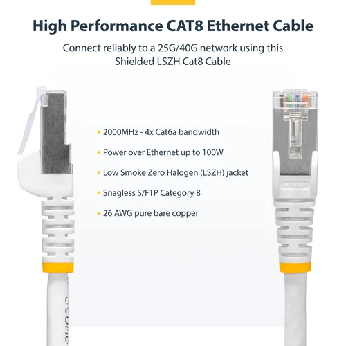 Connect reliably to a 25G/40G network using this Shielded LSZH Cat8 CableConnect to a 25/40Gbps switch or networking device using this Snagless S/FTP Category 8 Ethernet Cable. The 2000MHz maximum frequency enables up to four times higher throughput than Cat6a.Pure Bare Copper WireOur Snagless Cat8 Cables are designed for long-lasting performance. The 4-Pair Shielded and Foiled Twisted Pair (S/FTP) construction utilizes 26AWG pure bare copper wire for improved conductivity and low resistance, ensuring reliable transmission and minimal signal loss.Pure bare copper wiring offers consistent performance characteristics across different environments. Each pair is shielded in aluminum-mylar foil and tinned copper braid for enhanced EMI protection.Durable ConstructionThe Cat8 Ethernet Cable features snagless 50-micro gold-plated connectors that enable a precise fit to minimize wear and are rated beyond 750 connector mating cycles. The flexible Low Smoke Zero Halogen (LSZH) flame-retardant jacket emits low smoke and toxic fumes when exposed to extreme heat or in the event of a fire. This enables safer installations in poorly-ventilated areas including some industrial settings, self-contained environments such as trains and aircraft, as well as residential settings where compliance with building codes must be considered.The cable is rated to withstand -/+90-degree bends and routes well in confined spaces.Versatile DependabilityThe Shielded Cat8 Patch Cord is ideal for high-density 25/40GBASE-T networks and supports up to 100W output to Power over Ethernet (PoE++) devices. Establish connectivity to 25G/40G switches, Network Attached Storage (NAS), Storage Area Networks (SANs), and SFP modules. It facilitates reliable throughput and power to low-latency and critical PoE devices, including PoE switches, access points, and IP cameras.Backward compatibility with Cat 6/6a and Cat 5/5e standards ensure seamless integration into existing network environments. Our Snagless Cat8 cables are Fluke channel tested for guaranteed Cat8 performance.The StarTech.com Advantage