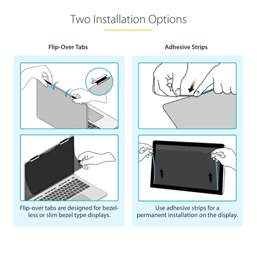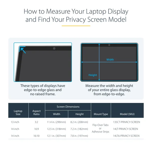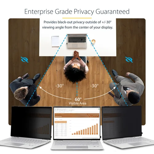 Prevent visual eavesdropping by limiting the viewing angle of your screen.This Laptop Privacy Screen is designed to work with laptops with 14-inch displays and 16:10 aspect ratio.Prevent visual eavesdroppingThis privacy filter is a convenient and cost-effective solution to protect confidential data from unwanted viewers. The privacy shield darkens your computer's screen from the side while providing a clear viewing angle of 60 degrees (+/- 30 degrees from center) to the user.Flip-Over and TouchThe feature enables you to quickly flip-over the privacy filter to share contents without uninstalling the filter. Your computer touch responsiveness is preserved by the ultrathin yet robust security shield, enabling seamless use. The privacy shield has a light transmittance of 60% providing optimal screen brightness and enhanced levels of privacy.Hassle-free InstallationInstall the privacy screen protector using the included adhesive strips or flip-over tabs. This unit is designed for use with bezel-less or slim bezel displays.Blue Light ReductionReduce eye strain and improve visual comfort by reducing blue light exposure. The 14-inch laptop screen filter blocks up to 51% of the blue light emitted from the display. Digital eye strain can lead to symptoms like headaches, dry eyes, and blurred vision.The StarTech.com Advantage