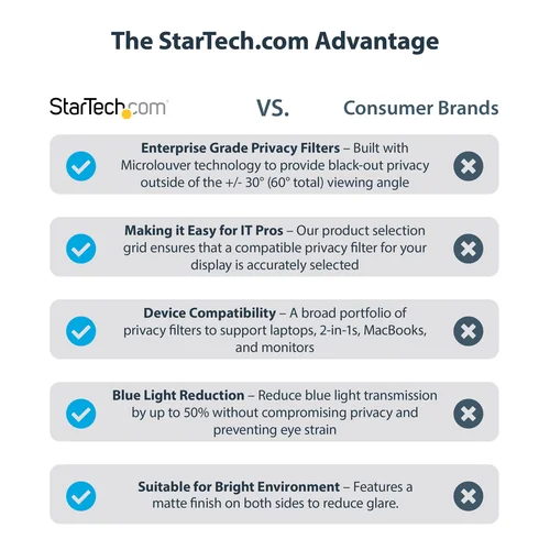 Prevent visual eavesdropping by limiting the viewing angles of your 14" MacBook Pro screenThis laptop privacy screen is compatible with the 2021 and 2023 14" MacBook Pro laptops.Prevent Visual EavesdroppingThis privacy filter is a convenient and cost-effective solution to protect confidential data from unwanted viewers. The privacy shield darkens your MacBook's screen from the side while providing a clear viewing angle of 60 degrees (+/- 30 degrees from center) to the user.Reversible FilterThe privacy screen protector is reversible, with a matte anti-glare side for environments prone to glare and a high-gloss side that helps retain color vibrancy. The matte side provides additional screen protection with a fingerprint and scratch resistant coating. The privacy shield has a light transmittance of 57.5% providing optimal screen brightness and enhanced levels of privacy.Hassle-free InstallationThe privacy filter is an exact fit design that will not interfere with top-mounted webcams, sensors, or when closing the lid. Affix the privacy screen shield using the included transparent and residue-free adhesive strips.Blue Light ReductionReduce eye strain and improve visual comfort with this blue light reducing privacy shield. It blocks up to 51% of the blue light emitted from the display in the 380nm - 480nm wavelength range. Digital eye strain can lead to symptoms like headaches, dry eyes, and blurred vision.The StarTech.com Advantage