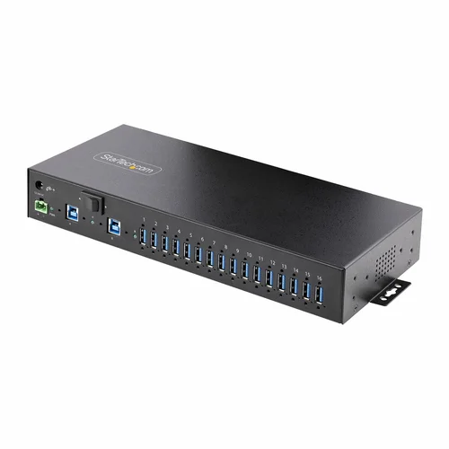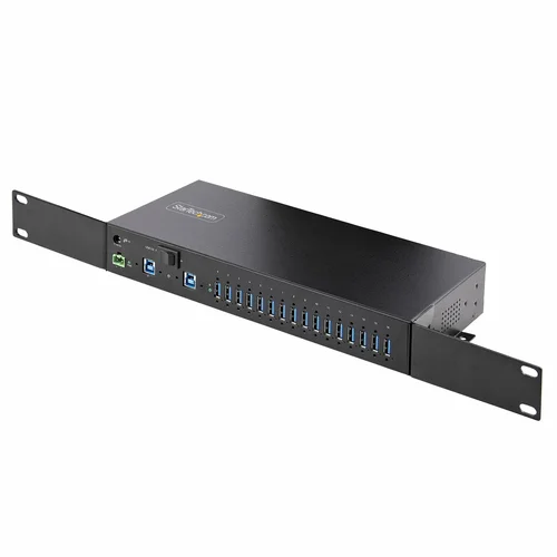 Add 16x USB 3.2 Gen 1 (5 Gbps) ports to two host computers, using this DIN-rail/Surface/Rack-mountable industrial hubThe 16-Port Industrial USB 5Gbps Hub with Power Adapter features 16 downstream USB-A ports. The rugged all-metal construction is suitable for use in industrial rackmount applications. Level-4 Electrostatic Discharge (ESD) protection safeguards against 15kV Air / 8kV Contact discharges. The hub features a 2-port host switch, enabling users to switch between two host devices.Engineered for Use in Industrial EnvironmentsThis USB hub is built to withstand harsh industrial environments. It features a rugged steel housing that protects against physical hazards such as drops and impacts. It is equipped with Level-4 ESD protection, with 15kV air and 8kV contact discharge ratings, to safeguard against damage caused by static electricity.Three Mounting OptionsThe 16-Port USB hub can be attached to a surface (e.g., atop/underneath a desk or wall mounted), rack mounted, or DIN-rail mounted. The 19" rackmount rails are compliant with EIA-310-D standards, ensuring compatibility with standard racks. These rails can be used to install the USB hub into 1U of rack space for applications in data centers and server rooms. Mount industrial automation and control equipment in an electrical enclosure or cabinet, using the standard DIN-rail (Top Hat/TH) mounting hardware.Power Adapter IncludedThis USB hub includes a 160W power adapter that connects to the 2-wire terminal block connector. When connected to the power adapter, the USB hub supports USB Battery Charging Specification 1.2 (BC 1.2) with 120W shared across all ports. Ports are grouped in 8 pairs (1&2, 3&4, 5&6, 7&8, 9&10, 11&12, 13&14, 15&16) and each pair supports a maximum of 3.0A/15W combined (1.5A/7.5W per port), or max 2.0A/10W per port when only one of both ports is used.For optional power redundancy, the USB hub features a secondary power input where a barrel-power adapter (not included) can be connected. The barrel-power input supports a 12-to-24-volt input range, and can be ideal for mission critical applications.Dual-Host SwitchThe USB Hub connects to two desktop or laptop computers, and features a dual-host switch enables easy toggling between the host devices.Enhance Productivity and Device Management with the StarTech.com Connectivity Tools ApplicationDeveloped to improve performance and security, StarTech.com Connectivity Tools is the only software suite on the market that is compatible with a wide variety of IT connectivity accessories. This product utilizes the USB Event Monitoring utility. Use this utility to track and log connected USB devices.For more information and to download the StarTech.com Connectivity Tools application, please visit: www.StarTech.com/Connectivity-ToolsThe StarTech.com Advantage
