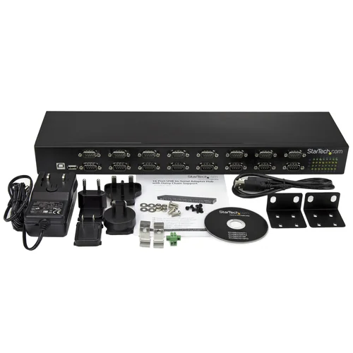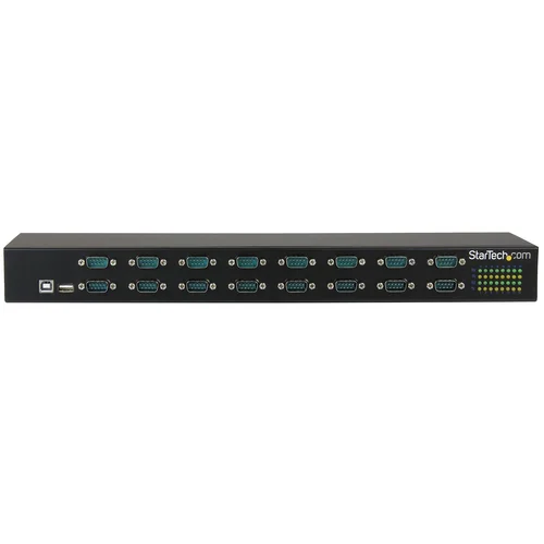 Convert a USB port into 16 RS232 serial ports in an industrial rack-mountable chassis - and daisy chain multiple hubs for a scalable solutionHere's an easy and cost-efficient way to add RS232 serial capability to your industrial setting. This 16-port USB-to-serial adapter hub features a sturdy, rack-mountable chassis, and supports daisy chaining, so you can connect multiple hubs together to increase your serial device port count.A scalable solution for changing needsThis rack-mountable USB serial hub lets you add 16 serial ports (RS232), with full control from your desktop or laptop computer system using a single USB port. The daisy-chain function gives you a cost-effective and scalable way to increase your serial port count and expand as your needs grow, without investing in a higher cost serial hub.Providing full control of your serial components from a single device, the USB serial hub is ideal for a multitude of applications including: industrial automation, self-serve automated kiosks, and monitoring of cameras and security systems.Built-in convenienceThe hub features COM port retention, which retains the assigned serial COM port values. This ensures that the same values are automatically re-assigned to the port provided by the adapter, in the event it is disconnected and re-connected to the host computer.Meets the demands of industrial environmentsWith its all-metal chassis, this rugged, rack-mountable hub fits into standard 19-inch server storage racks to provide an efficient industrial serial solution. It supports an extended operating temperature range of -40°C to 85°C (-40°F to 185°F); ensuring reliable performance even in the harshest environments. The USB-serial hub includes both an AC adapter and terminal block power, providing versatile power options.The StarTech.com Advantage