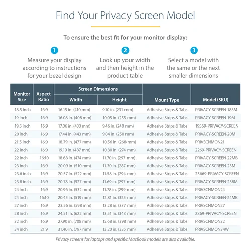 Prevent visual eavesdropping by limiting the viewing angles of your computer monitor screenMonitor privacy screen features a universal design compatible with 19.5" 16:9 aspect ratio monitors. The anti-glare design provides visual comfort while reducing the adverse effects of blue light emitted from the display. Reversible design allows you to quickly adjust to different light conditions throughout the day.Prevent Visual EavesdroppingThis privacy filter is a convenient and cost-effective solution to protect confidential data from unwanted viewers. The privacy shield darkens your computer's screen from the side while providing a clear viewing angle of 60 degrees (+/- 30 degrees from center) to the user.Reversible FilterThe privacy screen protector is reversible, with a matte anti-glare side for environments prone to glare and a high-gloss side that helps retain color vibrancy. The matte side provides additional screen protection with a fingerprint and scratch resistant coating. The privacy shield has a light transmittance of 57.5% providing optimal screen brightness and enhanced levels of privacy.Hassle-free InstallationAffix the privacy screen shield using the provided residue-free transparent adhesive strips or the side mounting tabs. The cutout on the top corner of the privacy screen makes it easy to remove for sharing content with trusted audiences or switching between the matte and glossy finishes.Blue Light ReductionReduce eye strain and improve visual comfort with this blue light-reducing privacy shield. It blocks up to 51% of the blue light emitted from the display in the 380nm - 480nm wavelength range. Digital eye strain can lead to symptoms like headaches, dry eyes, and blurred vision.The StarTech.com Advantage
