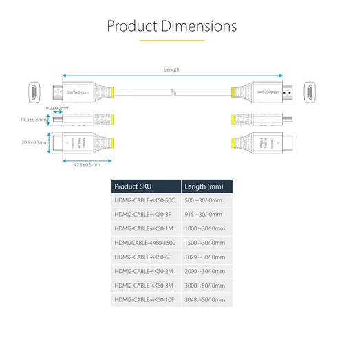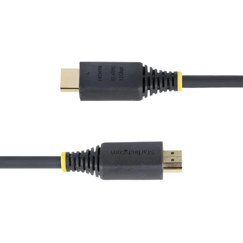 Connect reliably between HDMI UHD devices using this Premium Certified HDMI CableConnect to a 4K UHD TV or monitor, using this Premium Certified HDMI 2.0 Cable. The connector markings enable quick visual identification, distinguishing this cable from other similar-looking or unmarked HDMI cables. Eliminate guesswork and always choose the appropriate cable to support full HDMI 2.0 with Ethernet capabilities.Seamless CompatibilityFor seamless operation between HDMI-enabled devices, the Premium HDMI Cable is Certified for guaranteed HDMI 2.0 performance and backward compatibility. Certified cables provide consistent, reliable performance across multiple resolutions and refresh rates.Durable DesignThis High Speed HDMI Cable features a flexible TPE outer jacket that is tested to withstand 2,000 bending cycles at -/+60 degrees, and routes easily around corners and desk edges. Robust strain reliefs enable convenient positioning of the cable. The durable Gold-plated connectors are rated to operate beyond 10,000 insertions.Supported HDMI 2.0 Features:This Certified HDMI Cable supports full HDMI 2.0 features:• Resolutions up to 4K 60Hz using a compatible HDMI source and display• Supports high refresh rates including 1440p 144Hz and 1080p 240Hz• 21:9 Aspect Ratio support for cinematic viewing experiences• High Dynamic Range (HDR10) for higher contrast ratio and vibrant picture quality• High-Bandwidth Digital Content Protection (HDCP) 2.2 for a secure connection between source and display• Audio Return Channel (ARC) for sending audio from the TV back to an AV receiver or soundbar• Up to 32 Uncompressed Digital Audio Channels• HDMI Ethernet Channel (HEC) for network connectivity over HDMI• Backward compatible with previous HDMI versionsThis HDMI 2.0 Cable is constructed with braided aluminum mylar shielding to minimize EMI for clear, consistent audio/video output and long-term reliable performance.The StarTech.com Advantage