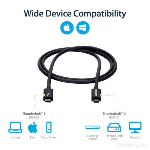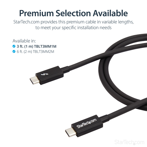 Provide twice the data transfer speed of any other cable type, enable full 4K 60Hz video, and power your devices with a single cableThis Thunderbolt™ 3 (20Gbps) cable lets you connect to any Thunderbolt 3 port (USB-C™) to deliver video and data to your Thunderbolt, USB, and DisplayPort devices. Plus, the cable can provide power for charging your devices, and you can link up to six Thunderbolt 3 devices as part of a daisy-chained connection.Faster data transfers when connected to Thunderbolt devicesThis cable supports data transfer rates of 20Gbps when connected to a Thunderbolt 3 device, so you can transfer photo and video files at twice the speed of a USB 3.1 (10Gbps) cable. For example, you can transfer a 4K movie in less than a minute. When connected to a USB 3.1 device, the cable supports data transfer rates of 10Gbps.USB-C compatibleThe Thunderbolt 3 cable is fully compatible with all of your USB 3.1 Gen 2 devices and can be used for charging and syncing your mobile devices. You can also connect and power USB-C laptops, such as your MacBook or Chromebook™, and USB-C peripherals, such as your portable hard drive and docking station.Full 4K videoThe cable supports full 4K 60Hz video and DisplayPort 1.2, and is compatible with existing DisplayPort displays. It's perfect for connecting your docking station or laptop to a monitor with astonishing resolution, contrast, and color depth for amazing detail.Versatile power deliveryThis Thunderbolt 3 cable delivers up to 100W of power for charging a laptop or powering a display, and 15W for bus-powered devices such as a hard drive enclosure.Thunderbolt networkingThe cable gives you an easy way to bridge multiple Thunderbolt 3 enabled laptops for peer-to-peer 10GbE networking. It’s perfect for setting up small workgroups and sharing peripherals such as printers and storage. You can also connect two Thunderbolt 3 laptops together for PC migrations.The TBLT3MM1M is backed by a 2-year warranty.The StarTech.com Advantage