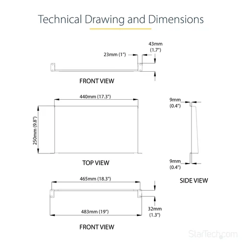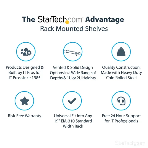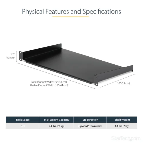Add a sturdy, 1U server rack shelf into almost any rack or cabinetThis 1U rack shelf lets you add 10 in. of flat storage space to any EIA-310 compliant server rack or cabinet.Ensure your equipment is secureThe durable fixed-rack shelf can hold up to 20 kg (44 lbs.) of equipment and is constructed using SPCC commercial-grade cold-rolled steel.Make the most of your available spaceThe 1U cantilever shelf lets you optimize your working space by giving you the ability to mount equipment to your rack instead of taking up desk or floor space. It’s perfect for your SOHO (small office, home office) environment, server room or any other location with limited space available.Customize your setupYou can install the 1U rack shelf in your rack at any height, giving you a stable surface for placing equipment that's un-mountable or storing your tools.The CABSHELF1U10 is backed by a StarTech.com lifetime warranty and free lifetime technical support.The StarTech.com Advantage