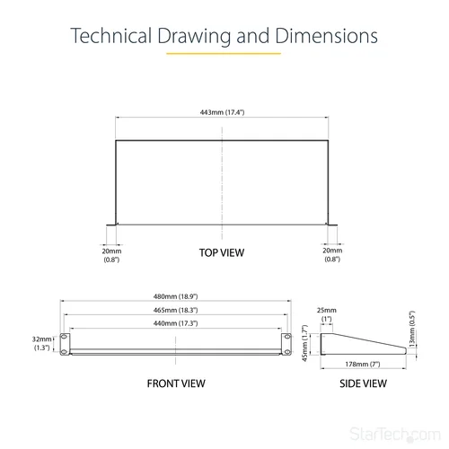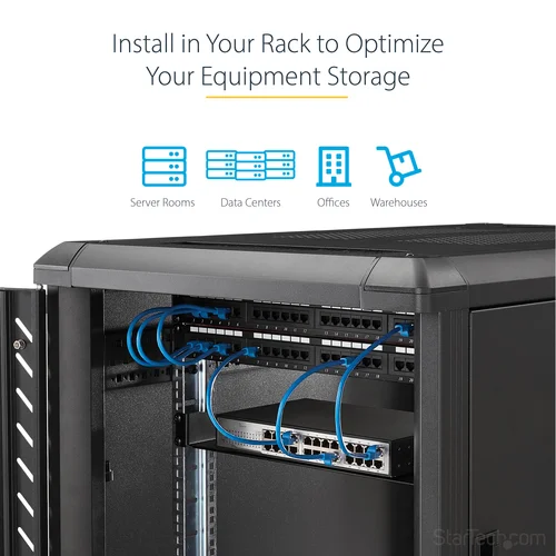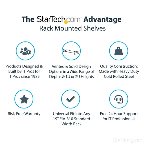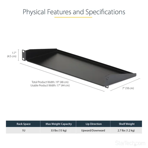 Add a 1U Compact Storage Shelf to any Standard 19" Server Rack or CabinetThe CABSHELF1U 1U (Black) Universal Fixed Server Rack Cabinet Shelf lets you add a compact fixed storage shelf to any standard 19-inch server rack or cabinet with front mount options.Constructed using SPCC commercial grade cold-rolled steel, this durable fixed rack shelf can hold up to 15kg (33lbs) of equipment - a perfect solution for storing small form non-rackmount equipment, tools, peripherals or accessories in your rack, to keep them readily accessible.The StarTech.com Advantage