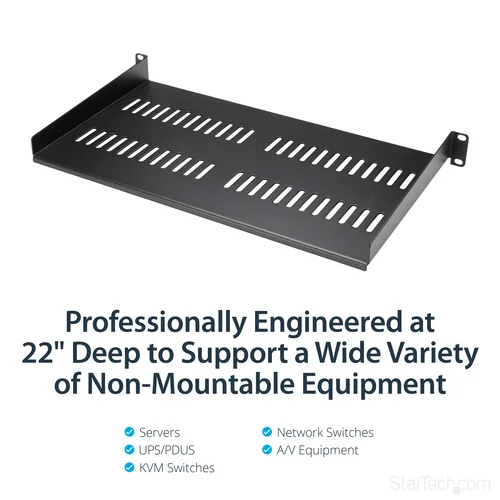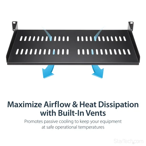 Add a sturdy, 1U server rack shelf into almost any rack or cabinetThis 1U rack shelf lets you add 10 in. of flat storage space to any EIA-310 compliant server rack or cabinet. The shelf is vented to improve air flow and help lower temperatures in your rack.Ensure your equipment is secureThe durable fixed-rack shelf can hold up to 20 kg (44 lbs.) of equipment and is constructed using SPCC commercial-grade cold-rolled steel.Make the most of your available spaceThe 1U cantilever shelf lets you optimize your working space by giving you the ability to mount equipment to your rack instead of taking up desk or floor space. It’s perfect for your SOHO (small office, home office) environment, server room or any other location with limited space available.Customize your setupYou can install the 1U vented rack shelf in your rack at any height, giving you a stable surface for placing equipment that's un-mountable or storing your tools.The CABSHELFV1U is backed by a StarTech.com lifetime warranty and free lifetime technical support.The StarTech.com Advantage
