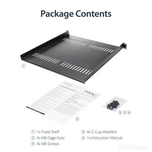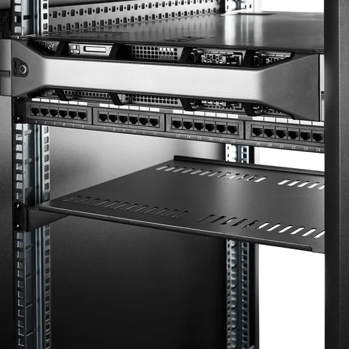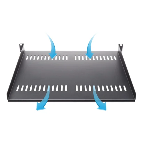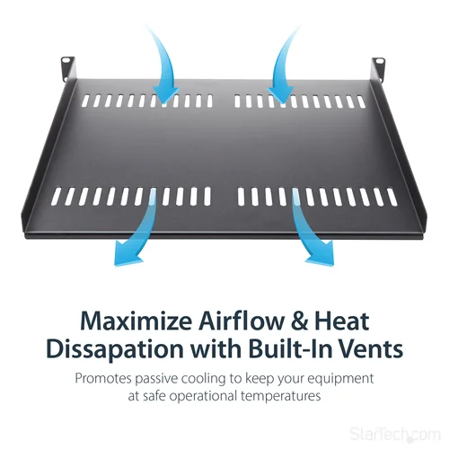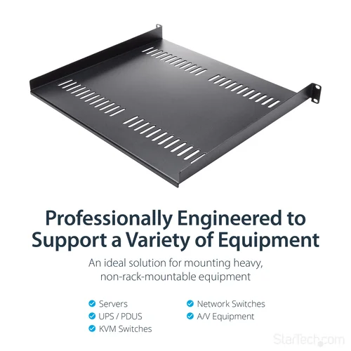 Add a sturdy, 1U server rack shelf into almost any rack or cabinetThis 1U rack shelf lets you add 16 in. of flat storage space to any EIA-310 compliant server rack or cabinet. The shelf is vented to improve air flow and help lower temperatures in your rack.Ensure your equipment is secureThe durable fixed-rack shelf can hold up to 20 kg (44 lbs.) of equipment and is constructed using SPCC commercial-grade cold-rolled steel.Make the most of your available spaceThe 1U cantilever shelf lets you optimize your working space by giving you the ability to mount equipment to your rack instead of taking up desk or floor space. It's perfect for your SOHO (small office, home office) environment, server room or any other location with limited space available.Customize your setupYou can install the 1U vented rack shelf in your rack at any height, giving you a stable surface for placing equipment that's un-mountable or storing your tools.The StarTech.com Advantage