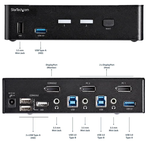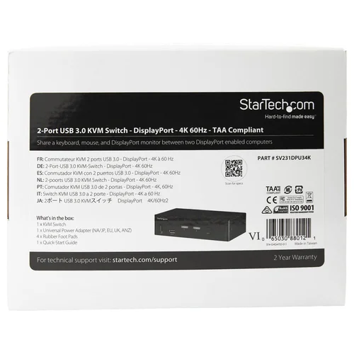 KVM with USB | TAA Compliant | USB 3.0 Hub | DisplayPort 1.2 | Digital & Analog AudioThis 2-port KVM switch combines 4K (60Hz) digital display capabilities with control of two connected computers.4K 60Hz Picture and Full Audio SupportThe DisplayPort KVM switch supports resolutions up to 4K at 60Hz. It drives one large monitor at the full 4K resolution or, using an MST adapter, can drive various DisplayPort multi-display setups totaling 4Kif you need to maximize viewing space. With support for digital audio (with supporting displays and sources) and separate 3.5 mm stereo audio, the DisplayPort 1.2 KVM switch delivers full audio compatibility.Integrated USB HubThe integrated USB 3.0 hub shares two peripherals (in addition to keyboard and mouse) among attached computers as if they were directly connected to your host computer, eliminating the cost of duplicate devices such as printers and scanners.Windows, Mac & Linux CompatibleWhile supporting Windows, this DP KVM switch is also compatible with Mac and Linux operating systems.Easy to OperateThe front-panel push buttons make it easy to switch between systems and activate the auto scan feature. The hotkey functionality makes accessing each system quickly, while a buzzer sound confirms the switch.StarTech.com offers a wide selection of high-quality KVM switches and KVM-related products to help you access your systems more efficiently without the expense and clutter of extra keyboards, mice, and monitors. This 2-port DisplayPort KVM switch is backed by a 2-year warranty and free lifetime technical support.The StarTech.com Advantage