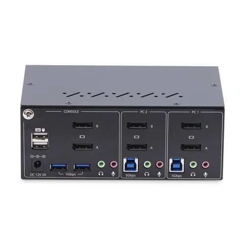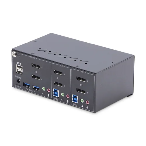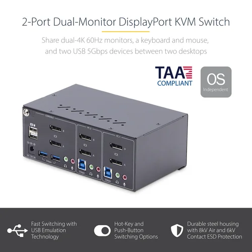 Share a mouse, keyboard, USB 5Gbps hub, and dual 4K 60Hz DisplayPort displays between two DisplayPort-enabled computersThis Dual-Monitor KVM Switch enables users to switch between two desktops that are USB-A and DisplayPort enabled. It allows for sharing of dual-4K 60Hz DisplayPort monitors, a keyboard and mouse, and two USB 5Gbps devices.Fast Switching with USB EmulationUSB Emulation technology enables faster switching of a keyboard, video, and mouse compared to traditional KVMs. USB Emulation also ensures compatibility with combination keyboards/mice as well as keyboards featuring additional function keys.Dual-4K 60Hz Displays & USB 5Gbps Hub PortsThis TAA-Compliant KVM Switch supports dual-4K 60Hz DisplayPort monitors, making it ideal for working with high-resolution graphics or video. Additionally, it offers two USB 3.2 Gen 1 (5Gbps) Hub Ports for fast data transfer, and two USB 2.0 HID Ports for the keyboard and mouse. 8kV air and 6kV contact Electrostatic Discharge (ESD) protection.Customizable SwitchingThis Universal KVM Switch provides various switching options, including hotkey or push-button switching. Hotkeys allow for independent switching of USB/Video and Audio, enabling audio playback from one computer while controlling the other. An audible buzzer confirms hotkey input, and LEDs provide a visual status of the selected host.Enhance Productivity and Device Management with the StarTech.com Connectivity Tools ApplicationDeveloped to improve performance and security, StarTech.com Connectivity Tools is the only software suite on the market that works with a wide range of IT connectivity accessories. The software suite includes:• Advanced Windows Layout Utility: Setup and save custom windows layouts.• MAC Address Pass-Through Utility: Improve network security.• USB Event Monitoring Utility: Track and log connected USB devices.• Wi-Fi Auto Switch Utility: Enable users to quickly access faster network speeds via wired LAN.For more information and to download the StarTech.com Connectivity Tools application, please visit: www.startech.com/connectivity-toolsThe StarTech.com Advantage