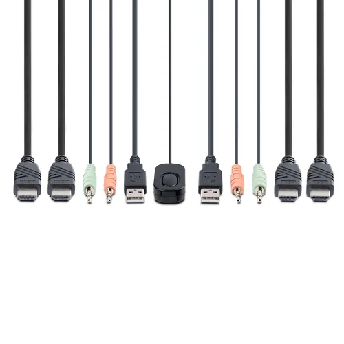 Share a mouse, keyboard, and dual-4K 60Hz HDMI displays between two HDMI-enabled computers, using this KVM Switch with built-in cablesThis Dual-Monitor KVM Switch enables users to switch between two USB-A and HDMI-enabled desktops, sharing dual-4K 60Hz HDMI monitors, a keyboard and mouse, and audio input/output devices.Hassle-Free SetupThe KVM switch is bus powered and features built-in dual-HDMI, USB-A, and 3.5mm Audio Input/Output cables. This ensures compatibility and performance between the KVM switch, monitors, and peripherals - without the need to select and purchase the cables required for those connections.CompatibilityThe 2-port KVM switch is compatible with all operating systems, including Windows, macOS, ChromeOS, and Linux. The KVM works with all hardware platforms including Intel, AMD, and Apple M1/M2.Intuitive ControlThe KVM switch features two options to switch between hosts - a remote push button and hotkey commands, using the downloadable software. The remote push button includes a 1.5m cable for optimal placement in the setup. Independent audio switching can be achieved through the software, utilizing keyboard shortcuts (i.e., hotkeys), ensuring uninterrupted audio when switching between host devices.Enhance Productivity and Device Management with the StarTech.com Connectivity Tools ApplicationDeveloped to improve performance and security, StarTech.com Connectivity Tools is the only software suite on the market that works with a wide range of IT connectivity accessories. The software suite includes:• Advanced Windows Layout Utility: Setup and save custom windows layouts.• MAC Address Pass-Through Utility: Improve network security.• USB Event Monitoring Utility: Track and log connected USB devices.• Wi-Fi Auto Switch Utility: Enable users to quickly access faster network speeds via wired LAN.For more information and to download the StarTech.com Connectivity Tools application, please visit: www.startech.com/connectivity-toolsThe StarTech.com Advantage