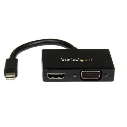 MDP2HDVGA Mini DisplayPort to HDMI and VGA This travel adapter lets you connect your mDP enabled Ultrabook™ or laptop computer to any VGA or HDMI® display. The 2-in-1 Mini DisplayPort adapter is the perfect accessory for your Microsoft Surface™ Pro 4, Surface Pro 3, Surface 3, Surface Pro 2 or Surface Book. Connect to any HDMI or VGA display Why carry multiple adapters when you only need one? Instead of keeping two different adapters on-hand, the MDP2HDVGA mDP travel adapter offers both VGA and HDMI outputs, so you’ll be able to connect from your laptop mDP output to any modern boardroom or classroom display -- an ideal plug-and-play solution for BYOD (Bring Your Own Device) applications at the office. Plus, because the converter supports video resolutions up to 1920x1200 or 1080p you can convert a Mini DisplayPort video source to HDMI or VGA without sacrificing video quality. Maximize portability The travel A/V adapter maximizes portability with a small footprint and lightweight design. The convenient design ensures the adapter is as portable as your laptop, fitting easily into your laptop bag or carrying case and eliminates the need to carry more than one adapter. With this adapter you can walk into virtually any boardroom ready to present, making a great first impression, and saving you the embarrassment of having to rummage through your bag looking for the right connector. The 2-in-1 converter is compatible with the Intel Thunderbolt port on your computer and installs easily with no software or drivers required. The MDP2HDVGA is backed by a 2-year StarTech.com warranty and free lifetime technical support. Features & Benefits • Connect a Mini DisplayPort computer to an HDMI display at your classroom desk or workstation • Use in your boardroom or office workstations for installations requiring 5 meters (15 feet) of cable • Install in your home workstation to make your DisplayPort computer compatible with your HDMI display • Connect your mDP video source to a 4K HDMI display Applications • Keep the adapter with you while traveling, to connect to virtually any display you come across • Connect your BYOD laptop/Ultrabook to a provided HDMI, or VGA display at work • Connect a VGA, or HDMI display to your Mini DisplayPort laptop, to use as a secondary monitor What’s in the package? • Mini DisplayPort™ to HDMI® / VGA Adapter • Instruction manual