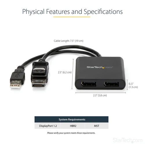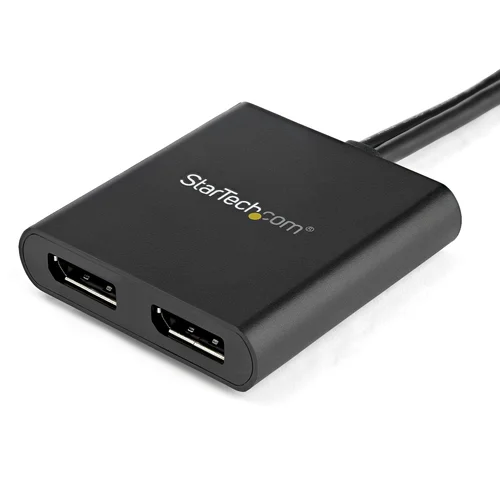 Use this adapter to connect two independent displays to a single DP 1.2 portThis MST hub lets you connect two monitors to your DisplayPort™ (DP) 1.2 equipped Windows® laptop or desktop. It’s USB powered, so the only thing you'll need to operate the hub is your computer.Increase productivity with multiple screensThe newest generations of computers are more portable than ever, which often means that you’re left with fewer video outputs and smaller integrated screens. This MST hub solves both of these problems by letting you connect two additional displays to your computer, which makes multitasking much easier.Connect to any displayWith the MST hub, you can use DisplayPort video adapters and cable adapters that enable you to connect HDMI, VGA or DVI displays. This ensures your MST hub will be compatible with virtually any television, monitor or projector. The hub is VESA and DisplayPort certified to support DP 1.2 enabled systems, for seamless integration with your existing video equipment.Configure your displays for any environmentUsing the MST hub, you can extend your desktop onto additional monitors and stream independent content to each display, giving you the freedom to multitask and increase your productivity. You can also mirror the same image onto multiple displays for remote viewing applications such as digital signage.Enjoy amazing video quality, without draining system resourcesMST technology uses your existing video card to minimize the use of system resources while delivering Ultra HD 4K resolutions. This unprecedented performance makes MST perfect for high-resolution applications such as graphic design, gaming and medical imaging.Note: When using a DisplayPort 1.1 video card the MST hub will act as a splitter, automatically mirroring your video source across all displays. Resolution limitations apply.The MSTDP122DP supports plug-and-play installation for a hassle-free setup, and is backed by a StarTech.com 3-year warranty and free lifetime technical support.Average resolution bandwidth allocation1920x1080 (High-definition 1080p) @60hz - 22%1920x1200 @60hz - 30%2560x1440 @60hz - 35%2560x1600 @60hz - 38%3840 x 2160 (Ultra HD 4K) @30hz - 38%Note: Exceeding 100% will reduce functionality.The StarTech.com Advantage