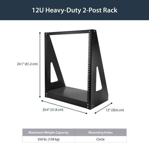 This 2-post rack stands on your floor or desktop to provide 12U of storage space for EIA-310-D compliant 19” rack-mount devices, such as telecommunication and A/V equipment. The rack creates a robust storage solution, with support for a total load capacity of 160 kg (350 lb.).Save space and cost, without losing weight capacityThis compact 2-post mounting solution offers a small footprint, and it’s engineered to provide exceptional stability, with a total weight capacity of up to 160 kg (350 lb.). The rack fits in virtually any environment, and can be positioned on any surface, such as your floor, desk or table. Save money, with a cost-effective, compact shipping packageThe 2-post server rack comes in a flat-packed box to reduce shipping volume, which also significantly reduces your costs in shipping. The rack is packaged efficiently, so you can easily store it for deployment at a later date.Hassle-free hardware installation, with tool-less clip nutsTo help make your equipment install easier, this rack includes tool-less clip nuts that seamlessly work with the punched round holes featured on this rack. The tool-less clip nuts provide an easy-to-install nut, unlike square cage nuts which can be a hassle.The 2POSTRACK12 is backed by a lifetime StarTech.com warranty with free technical support.