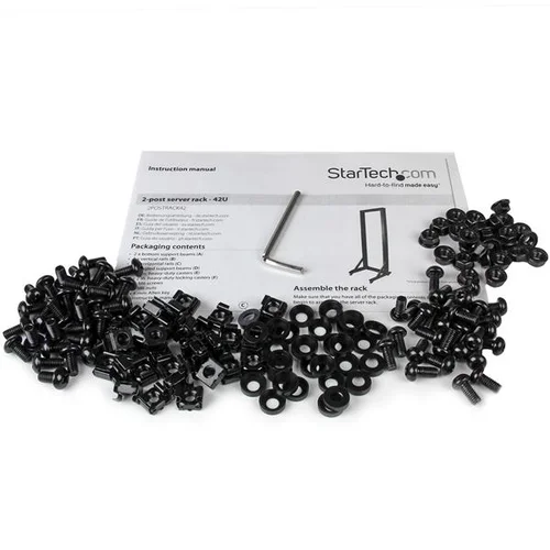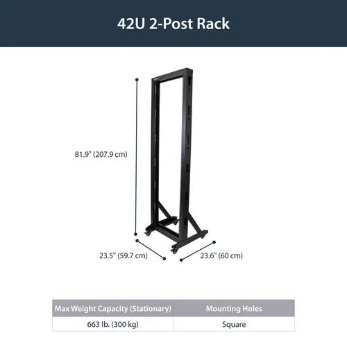 Store your server, network and telecommunications equipment in this sturdy 42U rack. With a 2-post design, the TAA compliant rack saves floor space and its dual-post, open-depth design makes it broadly compatible with longer equipment.Maximum portabilityThe 2-post rack features four swiveling casters, so you can easily move it around in your server room, office or studio. It’s easy to reposition or relocate the rack in order to connect your rack-mounted equipment to other devices throughout your workspace.High durabilityThe durable dual-post server rack is made of heavy-gauge steel, instead of aluminum, to ensure a stable installation platform. The rack supports a static loading capacity of up to 330 lb. (150 kg), and it’s compliant with several industry rack standards (EIA/ECA-310, IEC 60297, DIN 41494), to provide a stable platform that eliminates the need for concrete mounting kits.Wide compatibilityYou can easily mount your ANSI/EIA RS-310-D compliant network equipment to the rack without using additional hardware. It features square mounting holes on the frame and a universal design that's compatible with most rack equipment.The 2POSTRACK42 is backed by a StarTech.com 2-year warranty and free lifetime technical support.