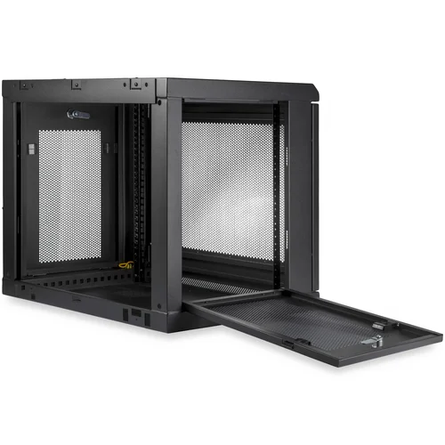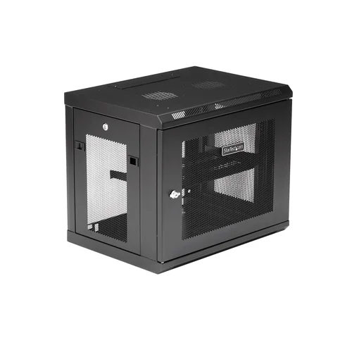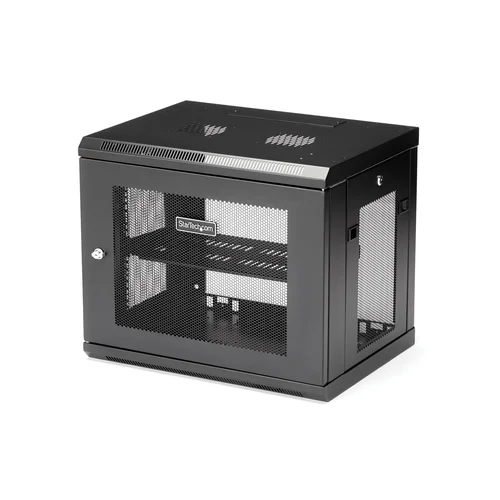 Use this wall mount network cabinet to mount your equipment to the wallThis 9U server rack cabinet lets you mount your EIA-310 compliant equipment to the wall. The enclosure features an adjustable mounting depth from 6 to 15 in. and offers a maximum load capacity of 200 lb. (90 kg).Save space in your office or server roomSave valuable floor space, by wall-mounting the enclosure. The wall-mounted design makes this enclosure the ideal solution for optimizing equipment storage in your classroom, retail store, server room or office. This rack also includes a 1U shelf that gives you a stable surface for storing your tools or placing equipment that's not rack-mountable.Easily install your servers and network equipmentThe wall-mount network rack makes it easy to install your equipment, with 2-post mounting rails that can be positioned to create more room at the front or the back of the enclosure depending on your requirements.The 9U network cabinet features a removable and reversible front door and removable side panels, each with quick-release mechanisms, so you can easily access your equipment. Plus, each door and panel on this rack features an independent lock, ensuring your equipment is secure. The wall-mount server rack also includes all of the cage nuts and mounting screws you'll need to fill the rack with equipment, saving you the time, hassle and cost of sourcing mounting hardware.For hassle-free cable management, the rack includes a 3-meter roll of hook-and-loop cable tie that makes it easy to keep your cables neat and tidy by binding them together or binding them to the rack. The self-gripping fabric can be cut to any size, enabling a wrap-around solution for the cables of any rack-mount equipment.Securely protect your equipmentThis server rack enclosure features heavy-duty steel construction, with lockable doors at all entrances. For hassle-free equipment installation, the mounting rails on the rack can be switched for use with square holes and cage nuts, or tapped rails.To ensure your equipment is running at an optimal temperature, the server rack/cabinet promotes passive cooling. It features mesh doors and vented top and bottom panels for maximum airflow.For simple and sturdy mounting, the rack's mounting holes are positioned 16 in. apart, so you can securely attach it to a wall using wall studs.The StarTech.com Advantage
