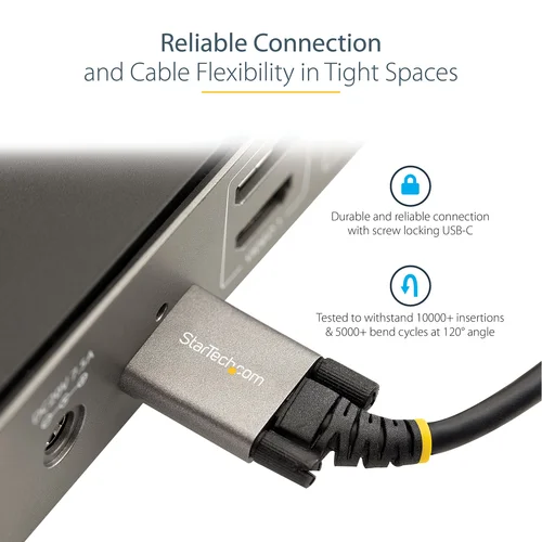 Side Screw Locking USB C Cable 10Gbps | 100W (5A) Power Delivery | DP Alt ModeHigh Performance CableThis side screw locking USB-C 3.2 Gen 2 10Gbps cable lets you connect your USB Type-C devices for syncing, charging, and powering your devices.The USB-C cable is also compatible with Thunderbolt 3 ports, allowing you to connect and charge your USB-C devices using your Thunderbolt 3 laptop.Reliable Connection with Screw Locking USB-CThis cable features dual locking screws that can securely connect to your USB-C peripherals and can prevent accidental disconnection from your devices such as external hard drives or docking stations.The screws are designed to fit all devices that use a standard side screw locking input, such as StarTech.com's DK31C3HDPD.The knurled screws can easily be removed from the cable completely allowing it to be used as a standard USB-C cable if required.Supports up to 100W (5A) with Power Delivery 3.0With up to 100W (5A) of power delivery, you can power and charge a USB-C laptop, such as your Apple MacBook or Microsoft Surface Book. Simply connect the cable to your USB-C laptop and to a USB-C wall charger.Deliver 8K video with DisplayPort 1.4 Alt ModeThe cable supports 8K 30Hz video with DisplayPort 1.4 and is backward compatible to connect your docking station or laptop to a monitor that supports 4K or 1080p resolutions.Charge your mobile devicesWhen used with devices that support PD 3.0, this cable charges up to 20V and 5A for a maximum of 100W. It can decrease your charge time and make sure your mobile devices are ready, whenever you need them.Quality BuildThis cable is constructed with durable long-lasting, flexible TPE jacket and strain relief. It has been tested to withstand 4000+ bends. It is built with aluminum-mylar foil with 85% braid coverage and EMI shielding for improved signal integrity.The USB31CCSLKV50CM from StarTech.com is backed by a 2-year warranty for guaranteed reliability.The StarTech.com Advantage