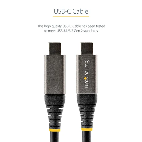 USB C Cable 10Gbps |100W (5A) Power Delivery | DP Alt ModeThis USB 3.2 Gen 2 10Gbps USB-C™ cable lets you connect your USB Type-C™ devices for syncing, charging and powering your devices.The cable is also compatible with Thunderbolt™ 3 ports, which means you can charge and sync your USB-C mobile devices using your Thunderbolt 3 laptop.Power your USB-C devicesWith up to 5A (100W) of power delivery, you can power a USB-C laptop, such as your Apple MacBook or Microsoft Surface Book. Simply connect the cable to your USB-C laptop and to a USB-C wall charger.You can use this USB Type-C cable to power your USB-C hard drive from the USB-C port on your laptop.This 50-centimeter cable is great for close-range connections to charge and sync your USB Type-C mobile devices with your laptop.You can also use the cable to charge your USB-C devices from a USB-C wall charger, car charger or power bank. It's the ideal cable for commuters for in-car use or to reduce clutter when syncing with your laptop.Deliver 8K Video with DisplayPort 1.4 Alt ModeThe cable supports 8K 30Hz video with DisplayPort 1.4 and is backward compatible for connecting your docking station or laptop to a monitor that supports 4K or 1080p resolutions.Keep as a spare while travelingReplace the USB-C charging cable that came with your device, or keep one as a spare while you're traveling, so that all of your devices will be ready to use whenever you need them while you're on the road.The USB31CCV50CM from StarTech.com is backed by a 2-year warranty for guaranteed reliability.The StarTech.com Advantage