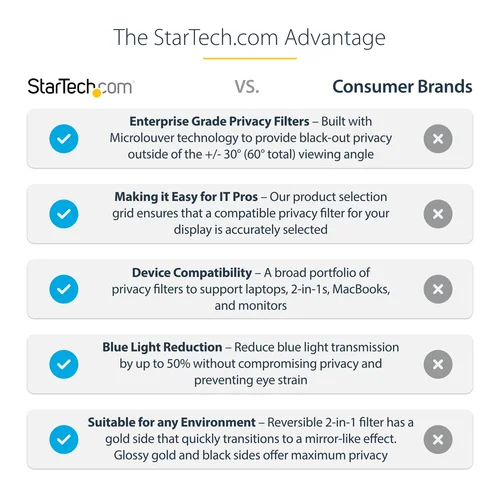 Prevent visual eavesdropping by limiting the viewing angle of a computer monitor screenThis Monitor Privacy Screen features a universal design compatible with 27-inch monitors with a 16:9 aspect ratio. Gold privacy screens are more reflective than black filters, helping to improve visual privacy when working in an office or public environment.Prevent Visual EavesdroppingThe gold security filter is a convenient solution that features a quick shift to a mirror-like effect to protect confidential data from unwanted viewers, while maintaining a clear view of 60 degrees (+/- 30 degrees from the center) for the user.Reversible FilterThe privacy screen protector is reversible. The glossy gold and black sides offer maximum privacy and help maintain color vibrancy. The privacy shield provides a light transmittance of 57.5%, providing optimal screen brightness and enhanced levels of privacy. The detachable design allows you to switch effortlessly between gold and black finishes.Hassle-free InstallationAttach the privacy screen shield using the provided residue-free transparent adhesive strips or the side mounting tabs. The cut-out on the top corner of the privacy screen makes it easy to remove for sharing content with a trusted audience or switching between the gold and black finishes.Blue Light ReductionReduce eye strain and improve visual comfort by reducing blue light exposure. The computer monitor filter blocks up to 51% of the blue light emitted from the display in the 380nm - 480nm wavelength range. Digital eye strain can lead to symptoms like headaches, dry eyes, and blurred vision.The StarTech.com Advantage