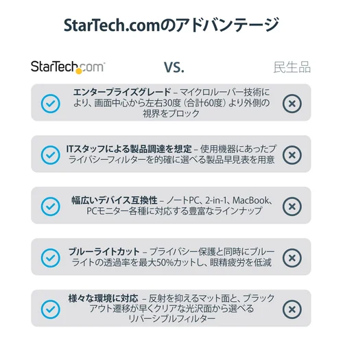 Prevent visual eavesdropping by limiting the viewing angles of your computer monitor screenMonitor privacy screen features a universal design compatible with 28" 16:9 aspect ratio monitors. The anti-glare design provides visual comfort while reducing the adverse effects of blue light emitted from the display. Reversible design allows you to quickly adjust to different light conditions throughout the day.Prevent Visual EavesdroppingThis privacy filter is a convenient and cost-effective solution to protect confidential data from unwanted viewers. The privacy shield darkens your computer's screen from the side while providing a clear viewing angle of 60 degrees (+/- 30 degrees from center) to the user.Reversible FilterThe privacy screen protector is reversible, with a matte anti-glare side for environments prone to glare and a high-gloss side that helps retain color vibrancy. The matte side provides additional screen protection with a fingerprint and scratch resistant coating. The privacy shield has a light transmittance of 57.5% providing optimal screen brightness and enhanced levels of privacy.Hassle-free InstallationAffix the privacy screen shield using the provided residue-free transparent adhesive strips or the side mounting tabs. The cutout on the top corner of the privacy screen makes it easy to remove for sharing content with trusted audiences or switching between the matte and glossy finishes.Blue Light ReductionReduce eye strain and improve visual comfort with this blue light-reducing privacy shield. It blocks up to 51% of the blue light emitted from the display in the 380nm - 480nm wavelength range. Digital eye strain can lead to symptoms like headaches, dry eyes, and blurred vision.The StarTech.com Advantage