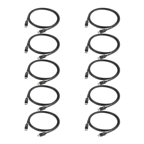 Set up multiple 4K UHD connections using this DisplayPort Cable 10 PackFaciliate multi-monitor setups using this DisplayPort 1.2 Cable 10-Pack. This cable facilitates high bandwidth video and multi-channel audio and is ideal for 4K workstations, docks, and high performance GPUs. Connect a 4K 60Hz UHD DisplayPort monitor to a host computer or MST hub.Seamless CompatibilityFor seamless operation between DisplayPort-enabled devices, the DisplayPort 1.2 Cable is VESA Certified for guaranteed DP 1.2 and backward compatibility with DP 1.1.Durable DesignThis DisplayPort cable features a flexible TPE outer jacket and can be routed around corners and desk edges. Robust strain reliefs enable convenient positioning of the cable, and latching gold-plated DP connectors attach securely to prevent accidental disconnection.Supported DisplayPort 1.2 Features:The Certified DisplayPort Cable supports the following DP 1.2 features:• Resolutions up to 4K 60Hz, using a compatible DP source and display• Supports high refresh rates including 1080p 120Hz and 1440p 75Hz• High-Bandwidth Digital Content Protection (HDCP) for a secure connection between source and display• Multi-Stream Transport (MST) for daisy-chaining multiple monitors• 8 Uncompressed Digital Audio Channels• Backward compatible with DP 1.1This DP 1.2 Cable is constructed with braided aluminum mylar shielding to minimize EMI for clear, consistent audio/video output and long-term reliable performance.The StarTech.com Advantage