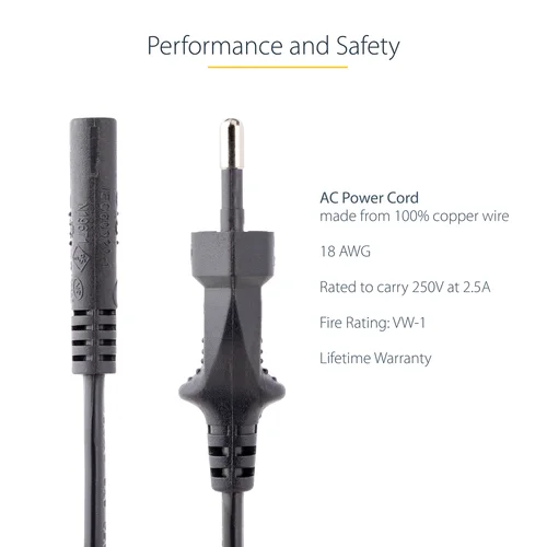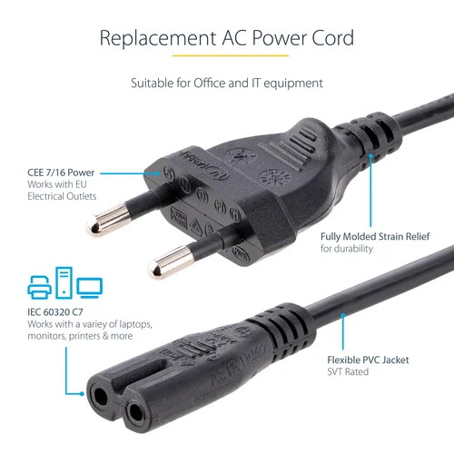 2m (6ft) Laptop Power Cord, EU Plug to C7 AC Cable, 18AWGThe 752E-2M-POWER-LEAD 2m Laptop Power Cord features one EU plug (CEE 7/16 Alternative II) and one non-polarized IEC 60320 C7 Connector It is a suitable replacement cable for a Lenovo, IBM, or other compatible laptop power bricks that features a C8 inlet.This product is backed for life, including free lifetime 24/5 multi-lingual technical assistance.The StarTech.com Advantage