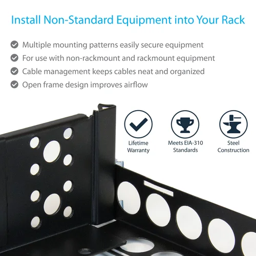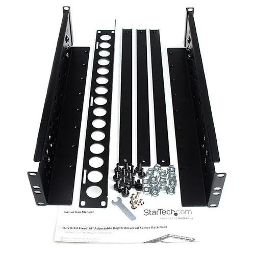 Mount 19" servers or networking hardware in any standard rack with these universal, adjustable depth 2U rack railsThese 2U server-rack rails let you mount non-rackmount equipment such as desktop servers, networking equipment or KVM switches, into your 19” server rack without sacrificing an additional 1U of rack space, like you would with a traditional shelf. The rack rails are also a great solution for mounting equipment with damaged rails or discontinued OEM equipment such as Dell™, IBM®, HP® or Apple servers that no longer have rack rails available.This TAA compliant product adheres to the requirements of the US Federal Trade Agreements Act (TAA), allowing government GSA Schedule purchases.Turn non-rackmount equipment into 2U rackmount hardwareThese rack rails add rackmount functionality to your non-rackmount gear, by cradling your equipment in an open frame supported by three sturdy crossbars. You can mount your non-rackmount equipment by mounting the rails to your server rack and placing your equipment on the undercarriage. For equipment that already features mounting holes, the rails also feature multiple mounting patterns to secure your equipment, for an added level of security.Universal design mounts to almost any 19" server rackAdhering to the EIA-310 standard for 19” rackmount equipment, these mounting rails are universally compatible with 19” server racks. The depth is adjustable for a variety of rack sizes and configurations. Plus, there is a rear cable management panel that’s removable for additional customization.Maximum durabilityTo ensure your equipment is secure, these mounting rails feature cold-rolled steel construction. The durable design can support a weight load of up to 100 lb (45 kg).The UNIRAILS2U is backed by a lifetime StarTech.com warranty with free technical support.The StarTech.com Advantage