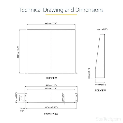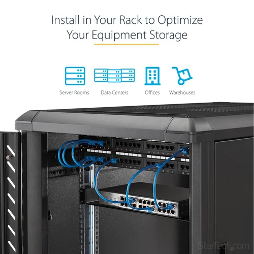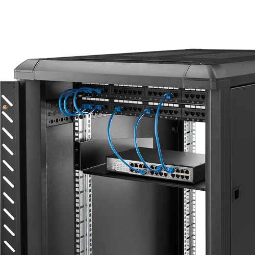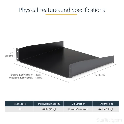 Add a sturdy, fixed shelf into almost any server rack or cabinetThe Black CABSHELF Standard Universal Server Rack Cabinet Shelf helps to efficiently organize your mission critical computer hardware and accessories by adding a fixed shelf with the capacity to hold up to 20 kg (44 lbs).Universally mountable in any standard front mount 19β server rack or cabinet, the rack shelf is constructed of sturdy, cold-rolled steel for long-term durability.Backed by a StarTech.com Lifetime warranty.The StarTech.com Advantage