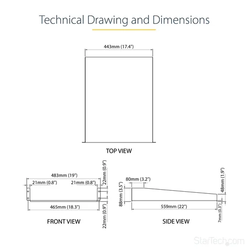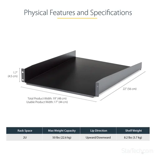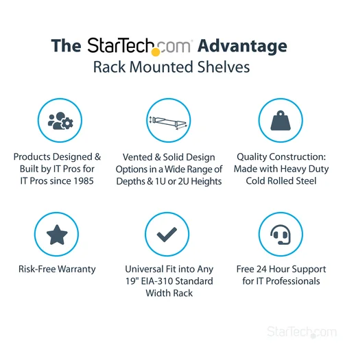 Add a sturdy, 22in depth fixed shelf into almost any server rack or cabinetThe CABSHELF22 2U 22in Depth Fixed Rack Mount Shelf lets you add a compact, 2U shelf to virtually any standard 19-inch server rack or cabinet with front mount options. This TAA compliant product adheres to the requirements of the US Federal Trade Agreements Act (TAA), allowing government GSA Schedule purchases.Our high-quality rack shelves are designed to withstand harsh work environments with ease. Constructed using SPCC commercial grade cold-rolled steel, this durable fixed rack shelf can hold up to 22kg (50lbs) of equipment - a perfect solution for storing small, non-rackmount equipment, tools, peripherals or accessories in your rack to keep them readily accessible.Backed by a StarTech.com Lifetime warranty.The StarTech.com Advantage