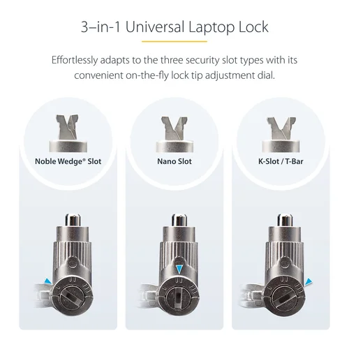 Secure a laptop, docking station, or other peripherals with this 3-in-1 master keyed cable lockThis 3-in-1 Universal Laptop Lock is a versatile solution compatible with Noble Wedge®; K-Slot (T-Bar), or Nano, providing flexibility and convenience.Adaptable SecurityA unique on-the-fly lock tip mechanism enables quickly adapting the lock tip to fit different security slot types. Simply rotate the lock selection dial to change the shape of the lock tip to match the security slot, without requiring additional tools or carry separate lock tips. The cut-resistant steel security cable is 6.6ft (2m) long providing reach and durability.Master Keyed LockThe lock is master keyed and include a set of two keys. The lock can withstand a pull force of 201lb (91.2kg) for K-slot, 217.8lb (98.8kg) for Nano, and 135lb (61.2kg) for Noble Wedge®; ensuring the computer or other devices remains safe from theft.Note:• The Master Key is not included but can be requested with proof of purchase.• The pull force values mentioned may vary if the security slots do not comply with the design standards specified by their respective manufacturers.Widely CompatibleThe versatile security lock is not limited to laptops or notebooks only. Expand the utility of this lock to secure other devices such as docking stations, monitors, printers, SFF computers, projectors, oscilloscopes, or other office and lab equipment. The lock is future-proof and is compatible with old and new computers and peripherals from various brands, including HP, Dell, Microsoft, and more. Spacers are included to protect the device from scuffing or denting the lock slot while ensuring a better fit to the device.Full-Motion Lock DesignThe diameter of the lock head is 0.5in (14mm) and features a ball joint design that allows for 360° rotation and 90° pivot of the lock head. This flexibility reduces coiling and minimizes strain on the notebook slot, enhancing durability and usability.The StarTech.com Advantage