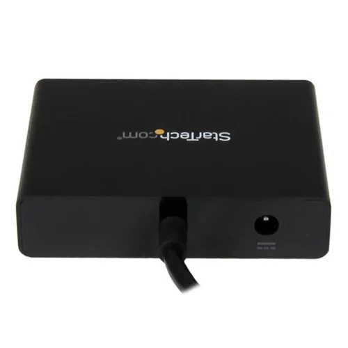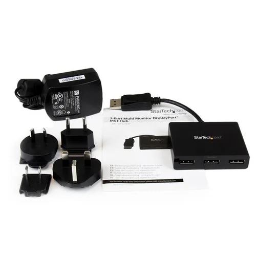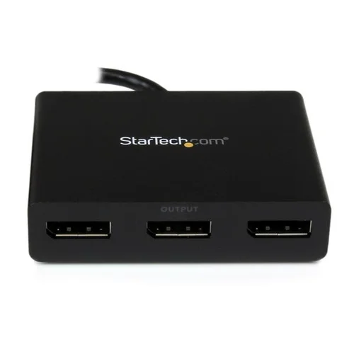 Use this adapter to connect three independent displays to a single DP 1.2 portThis MST hub lets you connect three monitors to your DisplayPort™ (DP) 1.2 equipped Windows® laptop or desktop.Increase productivity with multiple screensThe newest generations of computers are more portable than ever, which often means that you’re left with fewer video outputs and smaller integrated screens. This MST hub solves both of these problems by letting you connect three additional displays to your computer, which makes multitasking much easier.Connect to any displayWith the MST hub, you can use DisplayPort video adapters and cable adapters that enable you to connect HDMI, VGA or DVI displays. This ensures your MST hub will be compatible with virtually any television, monitor or projector. This MST hub is VESA and DisplayPort certified to support DP 1.2 enabled systems, for seamless integration with your existing video equipment.Configure your displays for any environmentUsing the MST hub, you can extend your desktop onto additional monitors and stream independent content to each display giving you the freedom to multitask and increase your productivity. You can also mirror the same image onto multiple displays for remote viewing applications such as digital signage.Enjoy amazing video quality, without draining system resourcesMST technology uses your existing video card to minimize the use of system resources while delivering Ultra HD 4K resolutions. This unprecedented performance makes MST perfect for high-resolution applications such as graphic design, gaming and medical imaging.Note: When using a DisplayPort 1.1 video card the MSTDP123DP will act as splitter, automatically mirroring your video source across all displays. Resolution limitations apply.The MSTDP123DP supports plug-and-play installation for a hassle-free setup, and is backed by a StarTech.com 3-year warranty and free lifetime technical support.Note: MST shares 21.6 Gbps across all attached displays. Higher resolutions can restrict the available bandwidth with the remaining ports, please see our guideline below for determining an ideal resolution for your setup. Certain graphics adapters have limited MST support and will only output to three displays in total. If more than three monitors are attached the fourth will be disabled.Average Resolution Bandwidth Allocation1920x1080 (High-definition 1080p) @60hz - 22%1920x1200 @60hz - 30%2560x1440 @60hz - 35%2560x1600 @60hz - 38%3840 x 2160 (Ultra HD 4K) @30hz - 38%Note: Exceeding 100% will reduce functionality.Examples of Supported Resolution ConfigurationsScreen 1 ResolutionScreen 2 ResolutionScreen 3 ResolutionTotal % of Bandwidth1920x1200 @60hz (30%)1920x1200 @60hz (30%)1920x1200 @60hz (30%)90%2560x1440 @60hz (35%)2560x1440 @60hz (35%)1920x1200 @60hz (30%)100%2560x1600 @60hz (38%)2560x1600 @60hz (38%)1920x1080 @60hz (22%)98%3840x2160 @30hz (38%)2560x1600 @60hz (38%)1920x1080 @60hz (22%)98%3840x2160 @30hz (38%)3840x2160 @30hz (38%)1920x1080 @60hz (22%)98%Examples of Unsupported Resolution ConfigurationsScreen 1 ResolutionScreen 2 ResolutionScreen 3 ResolutionTotal % of Bandwidth2560x1600 @60hz (38%)2560x1600 @60hz (38%)1920x1200 @60hz (30%)106%3840x2160 @30hz (38%)2560x1600 @60hz (38%)1920x1200 @60hz (30%)106%3840x2160 @30hz (38%)2560x1600 @60hz (38%)2560x1440 @60hz (35%)111%3840x2160 @30hz (38%)3840x2160 @30hz (38%)3840x2160 @30hz (38%)114%The StarTech.com Advantage