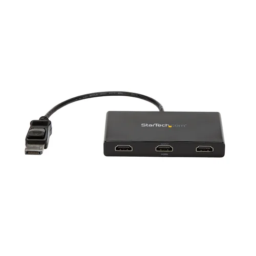 Use this adapter to connect three independent displays to a single DP 1.2 portThis MST hub lets you connect three HDMI® monitors to your DisplayPort™ (DP) 1.2 equipped Windows® laptop or desktop.Increase productivity with multiple screensThe newest generations of computers are more portable than ever, which often means that you’re left with fewer video outputs and smaller integrated screens. This MST hub solves both of these problems by letting you connect three additional displays to your computer, which makes multitasking much easier.Configure your displays for any environmentUsing the MST hub, you can extend your desktop onto additional monitors and stream independent content to each display. You can also mirror the same image onto multiple HDMI televisions or projectors for remote viewing applications such as digital signage.Enjoy amazing video quality without draining system resourcesMST technology uses your existing video card to minimize the use of system resources while delivering Ultra HD 4K resolutions. This unprecedented performance makes MST perfect for high-resolution applications such as graphic design, gaming and medical imaging.Note: When using a DisplayPort 1.1 video card the MSTDP123HD will act as splitter, automatically mirroring your video source across all displays. Resolution limitations apply.The MSTDP123HD supports plug-and-play installation for a hassle-free setup, and is backed by a StarTech.com 3-year warranty and free lifetime technical support.Note: MST shares 21.6 Gbps across all attached displays. Higher resolutions can restrict the available bandwidth with the remaining ports, please see our guideline below for determining an ideal resolution for your setup. Certain graphics adapters have limited MST support and will only output to three displays in total. If more than three monitors are attached the fourth will be disabled. Some monitors limit available resolutionAverage Resolution Bandwidth Allocation1920x1080 (High-definition 1080p) @60hz - 22%1920x1200 @60hz - 30%2560x1440 @60hz - 35%2560x1600 @60hz - 38%3840 x 2160 (Ultra HD 4K) @30hz - 43%Note: Exceeding 100% will reduce functionality.Examples of Supported Resolution ConfigurationsScreen 1 ResolutionScreen 2 ResolutionScreen 3 ResolutionTotal % of Bandwidth1920x1200 @60hz (30%)1920x1200 @60hz (30%)1920x1200 @60hz (30%)90%2560x1440 @60hz (35%)2560x1440 @60hz (35%)1920x1200 @60hz (30%)92%2560x1600 @60hz (38%)2560x1600 @60hz (38%)1920x1080 @60hz (22%)98%3840x2160 @30hz (43%)1920x1200 @60hz (30%)1920x1080 @60hz (22%)95%3840x2160 @30hz (43%)3840x2160 @30hz (43%)None86%Examples of Unsupported Resolution ConfigurationsScreen 1 ResolutionScreen 2 ResolutionScreen 3 ResolutionTotal % of Bandwidth2560x1600 @60hz (38%)2560x1600 @60hz (38%)1920x1200 @60hz (30%)106%3840x2160 @30hz (43%)2560x1600 @60hz (43%)1920x1200 @60hz (30%)116%3840x2160 @30hz (43%)2560x1600 @60hz (43%)2560x1440 @60hz (35%)121%3840x2160 @30hz (43%)3840x2160 @30hz (43%)3840x2160 @30hz (38%)124%The StarTech.com Advantage