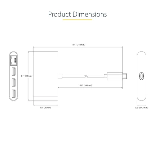 10/100/1000Mbps Ethernet | USB Type-C to 3x USB Type-A | USB 3.2 Gen 1 (5Gbps) | 1ft (30cm) Built-In Host CableThis USB-C Hub with Gigabit Ethernet adds three USB-A 3.2 Gen 1 (5Gbps) ports and one Gigabit Ethernet port to a USB-C enabled computer. The bus-powered USB Hub connects to a USB-C port on a laptop computer, using the built-in 1 ft. (30 cm) host cable. This USB hub is compact in size, facilitating portability when travelling.Gigabit EthernetThe USB hub features a Gigabit Ethernet adapter. The Ethernet controller is compatible with the IEEE 802.3u/ab standards and supports Wake-on-LAN (WoL), Jumbo Frames, and V-LAN Tagging. The network adapter enhances laptop network reliability, security, and performance, by utilizing wired 10/100/1000Mbps Ethernet.Connect up to Three USB-A DevicesThe 3-port USB 3.2 Gen 1 (5Gbps) Hub adds three USB-A ports by connecting to a single USB-C port. The USB hub is backward compatible with USB 2.0 (480Mbps) devices, ensuring support for a wide range of modern and legacy USB peripherals (e.g., external storage devices, thumb drives, HDDs/SSDs, HD cameras, mice, keyboards, webcams, and audio headsets).The USB Hub is bus-powered. It draws up to 15W of power from the USB-C host computer. Each downstream USB-A port is capable of providing up to 4.5W (5V/0.9A) of power to the connected peripherals. For added protection to connected USB devices, the USB ports feature Overcurrent Protection (OCP). OCP prevents USB peripherals from drawing more power than is safely allocated for the port.Plug and PlayThis device is compatible with all major operating systems, including Windows, macOS, ChromeOS, iPadOS, and Android. The Hub is automatically detected and configured upon connection to a host computer. This ensures automatic installation and setting configuration with any USB-C laptop, including Thunderbolt 3, Thunderbolt 4 and USB4 computers such as Apple MacBook (Intel/M1/M2), Lenovo X1 Carbon and Dell XPS. The built-in extra long 1 ft. (30 cm) USB-C host cable ensures easy setup and reduces connector strain on 2-in-1 devices such as the Surface Pro 7, iPad Pro, HP Elite X2 and laptops on riser stands.Enhance Productivity and Device Management with the StarTech.com Connectivity Tools ApplicationDeveloped to improve performance and security, StarTech.com Connectivity Tools is the only software suite on the market that is compatible with a wide variety of IT connectivity accessories. The software suite includes:•MAC Address Pass-Through Utility : Improve network security.•USB Event Monitoring Utility : Track and log connected USB devices.•Wi-Fi Auto Switch Utility : Enable users to quickly access faster network speeds via wired LAN.For more information and to download the StarTech.com Connectivity Tools application, please visit: www.StarTech.com/connectivity-toolsThis product is backed for 2-years by StarTech.com, including free lifetime 24/5 multi-lingual technical assistance.The StarTech.com Advantage