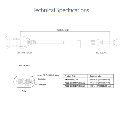 3m (10ft) Laptop Power Cord, EU Plug to C7 AC Cable, 18AWGThe 752E-3M-POWER-LEAD 3m Laptop Power Cord features one EU plug (CEE 7/16 Alternative II) and one non-polarized IEC 60320 C7 Connector It is a suitable replacement cable for a Lenovo, IBM, or other compatible laptop power bricks that features a C8 inlet.This product is backed for life, including free lifetime 24/5 multi-lingual technical assistance.The StarTech.com Advantage