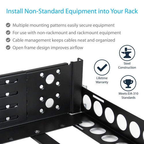 Mount 19" servers or networking hardware in any standard rack with these universal, adjustable depth 3U rack railsThese 3U server-rack rails let you mount non-rackmount equipment such as desktop servers, networking equipment or KVM switches, into your 19” server rack without sacrificing an additional 1U of rack space, like you would with a traditional shelf. The rack rails are also a great solution for mounting equipment with damaged rails or discontinued OEM equipment such as Dell™, IBM®, HP® or Apple servers that no longer have rack rails available.This TAA compliant product adheres to the requirements of the US Federal Trade Agreements Act (TAA), allowing government GSA Schedule purchases.Turn non-rackmount equipment into 3U rackmount hardwareThese rack rails add rackmount functionality to your non-rackmount gear, by cradling your equipment in an open frame supported by three sturdy crossbars. You can mount your non-rackmount equipment by mounting the rails to your server rack and placing your equipment on the undercarriage. For equipment that already features mounting holes, the rails also feature multiple mounting patterns to secure your equipment, for an added level of security.Universal design mounts to almost any 19" server rackAdhering to the EIA-310 standard for 19” rackmount equipment, these mounting rails are universally compatible with 19” server racks. The depth is adjustable for a variety of rack sizes and configurations. Plus, there is a rear cable management panel that’s removable for additional customization.Maximum durabilityTo ensure your equipment is secure, these mounting rails feature cold-rolled steel construction. The durable design can support a weight load of up to 100 lb (45 kg).The UNIRAILS3U is backed by a lifetime StarTech.com warranty with free technical support.The StarTech.com Advantage