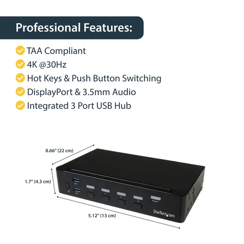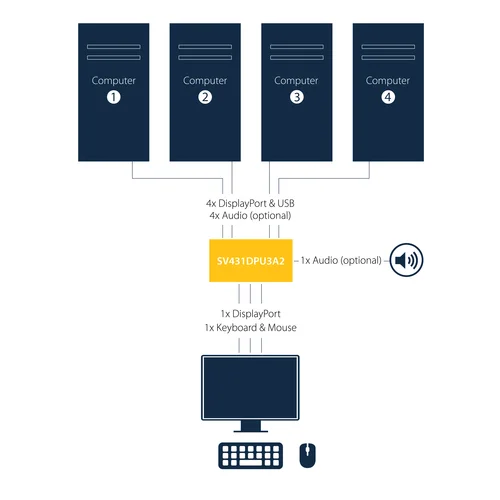 Control four DP computers using a single console with a built-in USB 3.0 hub for sharing additional peripheral devicesThis 4-Port USB 3.0 DisplayPort KVM switch lets you control four DisplayPort (DP) computers with a single monitor, keyboard and mouse. The KVM also features 3.5 mm audio and a built-in 3-port USB 3.0 hub.Convenient and cost-effective USB 3.0 peripheral sharingThis KVM switch offers a built-in 3-port USB 3.0 hub that's separate from your HID keyboard and mouse, so you can share USB peripheral devices between each connected computer and avoid the expense of separate equipment. The USB 3.0 hub automatically switches your connected USB devices to the selected computer, saving you the hassle of disconnecting and reconnecting your peripherals.With support for USB 3.0, you can achieve data transfer rates up to 5Gbps, to ensure flawless performance for your USB peripherals - great for quickly transferring data to external USB 3.0 drives.Astonishing picture qualityOffering support for resolutions up to Ultra HD 4K at 30 Hz, this 4-port DisplayPort KVM switch has the ability to drive large DP displays with ease, making it ideal for graphical applications that require high-resolution video support.Complete multimedia controlThe KVM switch features auxiliary 3.5 mm audio ports that enable you to share independent analog audio, from each of your connected computers, with your desktop speaker set. Independent audio, along with 4K DP video, gives you full multimedia control between different computers, making this KVM perfect for creative professional applications such as video and sound design or editing.The SV431DPU3A2 is backed by a StarTech.com 2-year warranty and free lifetime technical support.Rackmount your KVM switchIf you’d like to mount this KVM switch to your server rack, StarTech.com offers a 1U Rackmount Bracket (sold separately) that turns this KVM into a rackmountable KVM.The StarTech.com Advantage- Easily share peripheral devices using the built-in USB 3.0 hub- Astonishing picture quality with support for Ultra HD 4K resolutions- Full multimedia control with separate 3.5 mm auxiliary support