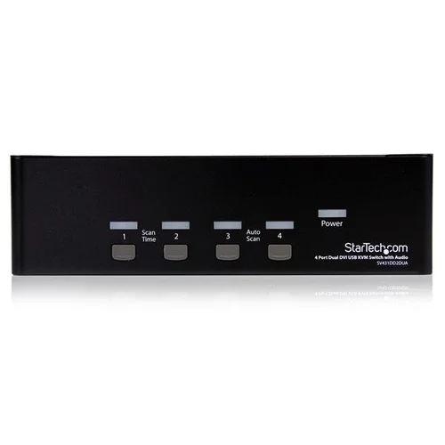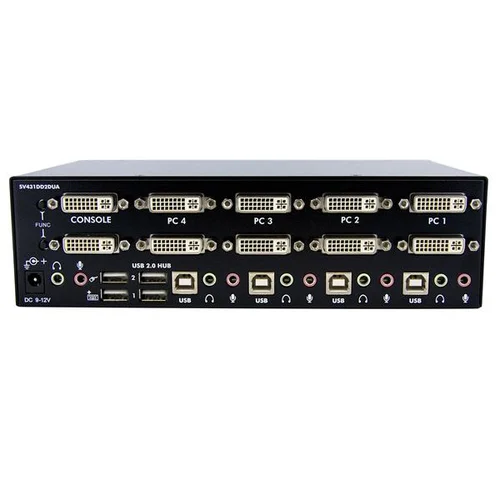 Share a keyboard, mouse and dual DVI displays/monitors between 4 multimedia computersThe SV431DD2DUA 4-port Dual DVI USB KVM Switch allows up to four PCs, each with dual DVI video outputs, to share two monitors, one microphone and set of speakers, one keyboard and one mouse as well as two other USB peripherals. An ideal solution for graphic designers, CAD/CAM designers or educational and financial institutions, the dual view KVM Switch allows you to instantly switch back and forth between dual DVI display PCs at the touch of a button, while maintaining professional level video quality on both monitors. The dual DVI switch also features an integrated USB hub port that allows USB 2.0 peripherals such as thumb drives, external hard drives or web cams to be shared between attached systems - eliminating duplicate peripheral costs.Please Note: While both DVI-I (analog mode) and DVI-D (digital only) are supported by the KVM, both source PCs should output the same signal type for proper switching. It is recommended wherever possible to use DVI-D cables across all PC to KVM and KVM to Console connections. Please contact technical support if you require assistance identifying your source.Backed by a StarTech.com 3 year warranty and free lifetime technical support.The StarTech.com Advantage- Integrated USB 2.0 hub and Mic/Audio ports allow the user to have full multimedia control of two computers and share USB peripherals eliminating the expense of duplicate devices- Take full advantage of Dual head video cards by switching up to four machines across two high resolution DVI monitors- Absolutely no software or drivers required providing a completely OS independent KVM solution
