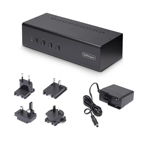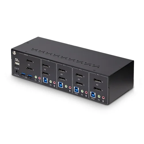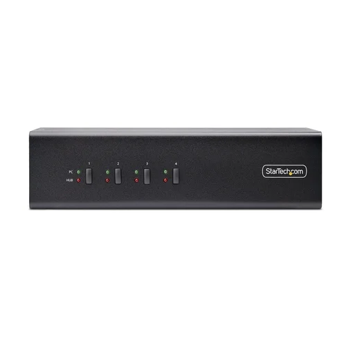 Share a mouse, keyboard, USB 5Gbps hub, and dual 4K 60Hz DisplayPort displays between four DisplayPort-enabled computersThis Dual-Monitor KVM Switch enables users to switch between four desktops that are USB-A and DisplayPort enabled. It allows for sharing of dual-4K 60Hz DisplayPort monitors, a keyboard and mouse, and two USB 5Gbps devices.Fast Switching with USB EmulationUSB Emulation technology enables faster switching of a keyboard, video, and mouse compared to traditional KVMs. USB Emulation also ensures compatibility with combination keyboards/mice as well as keyboards featuring additional function keys.Dual-4K 60Hz Displays & USB 5Gbps Hub PortsThis TAA-Compliant KVM Switch supports dual-4K 60Hz DisplayPort monitors, making it ideal for working with high-resolution graphics or video. Additionally, it offers two USB 3.2 Gen 1 (5Gbps) Hub Ports for fast data transfer, and two USB 2.0 HID Ports for the keyboard and mouse. 8kV air and 6kV contact Electrostatic Discharge (ESD) protection.Customizable SwitchingThis Universal KVM Switch provides various switching options, including hotkey or push-button switching. Hotkeys allow for independent switching of USB/Video and Audio, enabling audio playback from one computer while controlling another. An audible buzzer confirms hotkey input, and LEDs provide a visual status of the selected host.Enhance Productivity and Device Management with the StarTech.com Connectivity Tools ApplicationDeveloped to improve performance and security, StarTech.com Connectivity Tools is the only software suite on the market that works with a wide range of IT connectivity accessories. The software suite includes:• Advanced Windows Layout Utility: Setup and save custom windows layouts.• MAC Address Pass-Through Utility: Improve network security.• USB Event Monitoring Utility: Track and log connected USB devices.• Wi-Fi Auto Switch Utility: Enable users to quickly access faster network speeds via wired LAN.For more information and to download the StarTech.com Connectivity Tools application, please visit: www.startech.com/connectivity-toolsThe StarTech.com Advantage