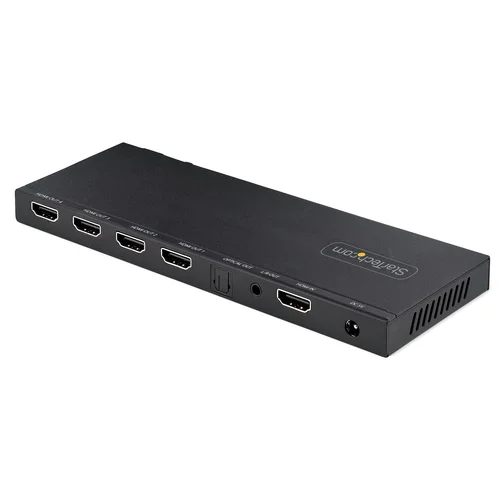 4-Port HDMI Splitter | 4K 60Hz | Built-In Scaler | 3.5mm, Optical, and HDMI AudioThis 4-port HDMI splitter with built-in scaler connects an HDMI video source to four HDMI displays, with support for UHD 4K resolutions, HDR (High Dynamic Range), and 7.1 channel audio.4K 60Hz ResolutionThis 4-way HDMI splitter supports up to 4K 60Hz resolution, at 4:4:4 chroma subsampling. The built-in scaler enables enables the concurrent output of 2 resolutions, ideal for environments where there is a variety of displays, monitors, and projectors.Flexible AudioThis 4K HDMI Splitter features HDMI, 3.5mm, and Optical audio outputs, enabling connections to a variety of speakers and/or amplifiers. Simultaneous audio output is supported across all the audio ports.Robust Installation OptionsThis HDMI splitter supports active HDMI cables and HDMI extenders (sold separately), facilitating installations at a distance from the displays (e.g., within a remote AV component cabinet). The metal enclosure and 8kV air and 4kV contact Electro-static Discharge (ESD) protection is suitable for installation in a variety of environments.This product is backed for 2-years, including free lifetime 24/5 multi-lingual technical assistance.The StarTech.com Advantage