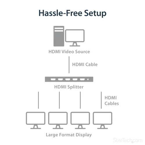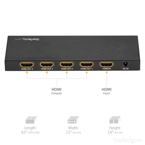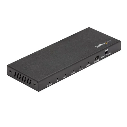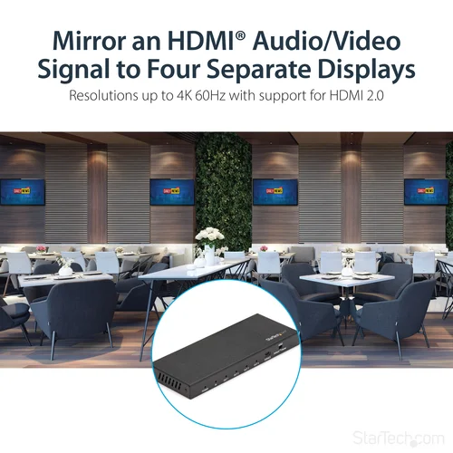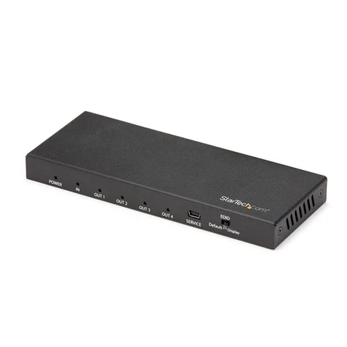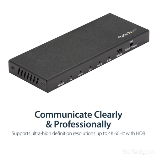1 In 4 Out Video Splitter | HDMI 2.0 | HDR | 2-Year WarrantyThis 4-Port 4K HDMI splitter connects your HDMI video source to four HDMI displays at the same time, without distorting or degrading your video signal. For dependable performance, the splitter features a durable metal housing that provides passive cooling.True 4K at 60Hz and HDRWith transmission bandwidth up to 18Gbps, this HDMI splitter is fully compatible with your HDMI 2.0 equipment, supporting UHD resolutions up to 4096x2160 (4K) at 60Hz. For smooth video and color transitions, the splitter offers 4:4:4 chroma subsampling, so every pixel gets its own unique color.The splitter also supports High Dynamic Range (HDR) imaging, offering a greater luminosity than standard digital imaging.Widely CompatibleThe 4-way HDMI splitter supports HDCP 2.2 and is backward compatible with 4K 30Hz and 1080p displays. This ensures that it will work with almost any HDMI source, or destination device such as computers, Blu-ray players, monitors, TVs and projectors. Perfect for digital signage applications, where equipment may vary throughout your site.Easy InstallationFor hassle-free setup, the 1x4 HDMI splitter offers easy plug-and-play installation. The splitter also saves you setup time by automatically passing EDID between your video source and the display attached to port 1, ensuring settings like native resolution and refresh rate are configured properly.ST124HD202 is backed by a 2-year StarTech.com warranty and free lifetime technical support.The StarTech.com Advantage