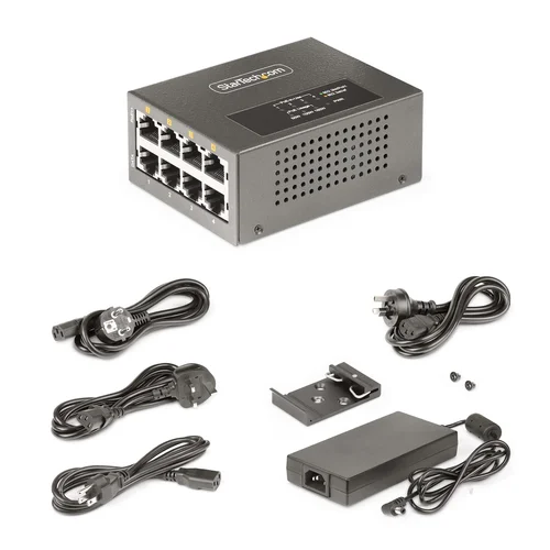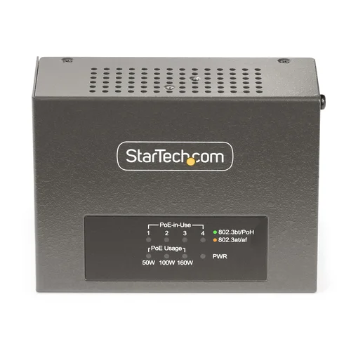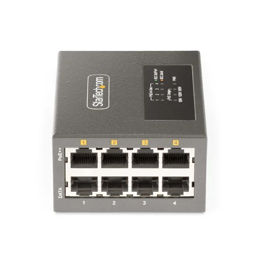 Supply power and data to up to four remote Powered Devices (PDs) with this PoE/PoE+/PoE++ injectorThis 4-Port Multi-Gigabit PoE++ Injector Hub serves as Power Sourcing Equipment (PSE) and enables multigigabit speeds of 5Gbps, 2.5Gbps, 1Gbps, 100Mbps, and 10Mbps across four Ethernet ports. This mid/end-span injector is capable of transmitting network data and power up to 328ft (100m) for remote installations. The PoE, PoE+, PoE++ compatibility and selectable power output ensure seamless compatibility with Powered Devices (PD). The TAA-compliant injector includes a Universal Power Adapter for different regions (NA/JP, EU, UK, and ANZ).Versatile PoE InjectorMultiport PoE Injector supports the IEEE 802.3af, 802.3at, and 802.3bt (Type 3 and Type 4) standards for Power Sourcing Equipment (PSE), delivering up to 52V DC and 95Watts. This flexibility eliminates the need for a separate power source for remote networked devices such as IP cameras, access control devices, remote kiosks (POSs), wireless access points, PoE lighting, and digital signage.Experience streamlined cable management with all network cables routed from one side of the unit for a clean and organized setup.Flexible Power OptionsTailor the power output to the specific needs of the device using the Power Output Switch. The options include 90W, 95W PoH, or legacy 60W (for UPoE/UPoE+) for all the ports on the PoE Injector Adapter.The Level-4 ESD protection (15kV air and 8kV contact) enhances device safety and reduces EMI for stable operation, minimizing the risk of downtime and hardware failures.Increased Network SpeedsThe unmanaged PoE Injector with NBASE-T technology provides access to an increased bandwidth up to 5Gbps, significantly reducing network slowdowns during data-intensive applications such as streaming high-definition video feeds, high-speed Internet, access local network resources, online or local network backups, and FTP access.The StarTech.com Advantage