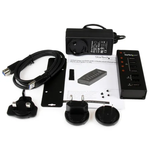 Add 4 USB 3.2 Gen 1 hub ports, plus 3 dedicated USB charging ports (7 total) through a single USB 3.2 Gen 1 host connectionThe ST4300U3C3 USB 3.2 Gen 1 Hub enables simultaneous data hub and USB charging functionality by adding three dedicated USB charge ports, as well as four USB 3.2 Gen 1 data ports, for a total of seven ports, all through a single USB 3.2 Gen 1 host connection.The USB hub ports are compliant with the SuperSpeed USB 3.2 Gen 1 specification, offering data transfer rates up to 5 Gbps, and are backward compatible with USB 2.0 and 1.x specifications.This externally powered USB hub also integrates 3 dedicated USB charging ports, providing 2 x 1A and 1 x 2A ports, enabling both data hub and USB charging station functionality. Support for USB Battery Charging Specification 1.2 lets you charge most mobile devices, including the Apple® iPhone®, iPad®, Microsoft® Surface™, Samsung Galaxy Tab™ and more.Designed for easy access to the ports when connecting or disconnecting devices, the hub features an upright port orientation, in a compact and durable metal enclosure. For added flexibility, the hub includes a bracket for wall-mounted installations.Backed by a StarTech.com 2-year warranty and free lifetime technical support.The StarTech.com Advantage