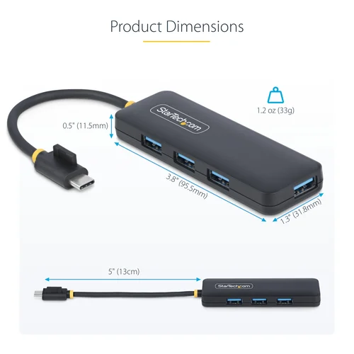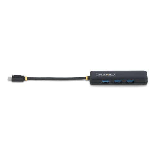 Add four external USB 3.0 ports to your notebook or Ultrabookâ„¢ with a slim, portable hubConnect up to four USB 3.0 devices to a laptop/PC via a single available USB Type-C port.Add USB Ports Anywhere You GoWith its compact, lightweight, and USB-powered design, this 4-port USB hub is perfect for mobility and travel. It easily fits into a laptop bag, allowing you to expand your connection options almost anywhere you need to. The hub also features small-footprint housing, which means it takes up less desk space. It's perfect for connecting common USB devices such as a mouse, keyboard, or flash drive.Bus-Powered Design Makes Travel Hassle-FreeThis versatile hub features a built-in 5in (13cm) USB cable and is bus-powered, so it draws its power directly from the computer's USB port, reducing clutter and simplifying setup by eliminating the need for an external power adapter.Convenient Port AccessWith three ports on one side and one on the end, this hub provides easy access for connecting and disconnecting devices.Universally Supported for Easy InstallationThe USB Hub is OS independent, supporting all operating systems (Windows, macOS, ChromeOS, and Linux), and installs automatically when connected to a computer. Additionally, this hub is compatible with all hardware platforms, including Intel, AMD and Apple Silicon.The StarTech.com Advantage