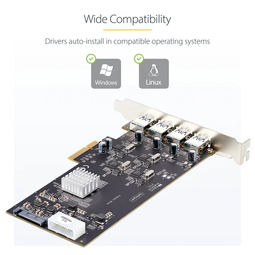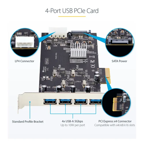 Add four 5Gbps USB Type-A ports through via PCI ExpressUpgrade or expand the USB connectivity of a desktop computer or server by adding four independent USB Type-A 5Gbps ports over a single PCI Express 2.0 x4 connection.Dedicated USB 5Gbps Per PortWhen multiple devices are connected, traditional single-bus USB 3.2 Gen 1 cards share the maximum bandwidth across all ports. By employing four host controller chipsets, each port operates on its own independent channel, providing up to 5Gbps to each USB port, reducing performance bottlenecks and effectively quadrupling the total available bandwidth to 20Gbps.Charge USB DevicesThis USB PCIe expansion card can receive supplemental power through SATA or LP4 connectors. It supports the Battery Charging 1.2 (5V 1.5A) specification and provides up to 5V 2A (10W) on the USB Type-A ports when the bus power from the motherboard is insufficient.CompatibilityThe PCI Express USB card drivers auto-install in most major operating systems, including Windows 8 and later, macOS, and Linux. The expansion card supports hardware platforms such as Intel, AMD, and Apple Silicon and fits in PCI Express x4, x8, and x16 slots. Horizontal USB ports enhance compatibility with different computer cases, reduce the risk of port clearance issues, and accommodate a wider range of USB devices and cables.The StarTech.com Advantage