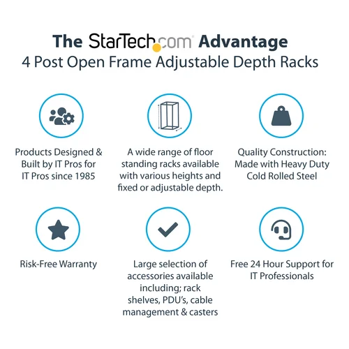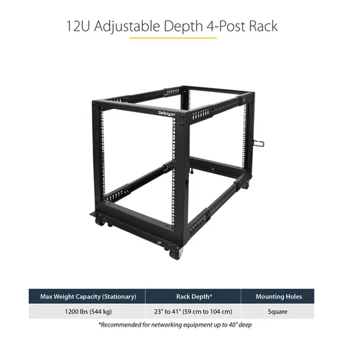 Computer Equipment Rack | 22" to 40" Adjustable Mounting Depth | Casters | Leveling Feet | Cable Management HooksThe 4POSTRACK12U 12U Server Rack lets you store your servers, network and telecommunications equipment in a sturdy, adjustable depth open-frame rack.Designed with ease of use in mind, this 12U rack offers easy-to-read markings for both rack units (U) and depth, with a wide range of mounting depth adjustments (22 - 40in) that make it easy to adapt the rack to fit your equipment.This durable 4-post rack supports a static loading capacity of up to 1200lbs (544kg), and offers compliance with several industry rack standards (EIA/ECA-310, IEC 60297, DIN 40494) for a universal design that's compatible with most rack equipment.For a complete server storage solution that saves you time and hassle, the rack includes optional accessories such as casters, leveling feet and cable management hooks. The base is also pre-drilled for securely fastening the rack to the floor if needed, providing you with additional stability to better suit your server environment.The StarTech.com Advantage